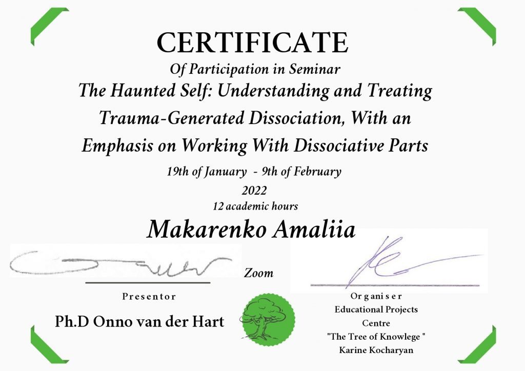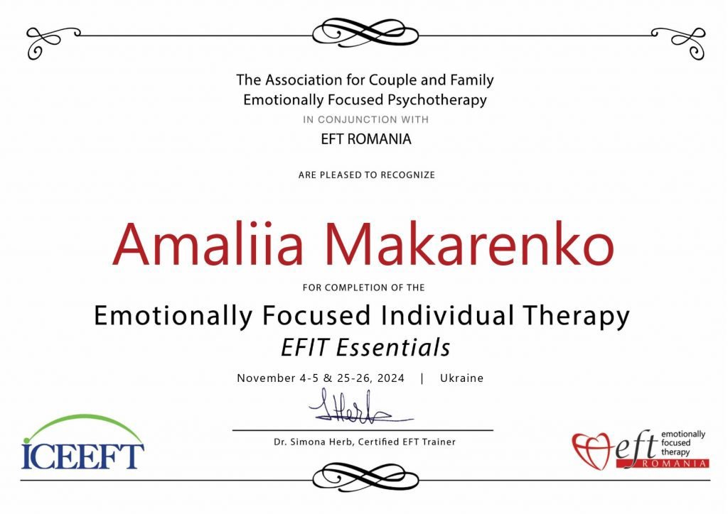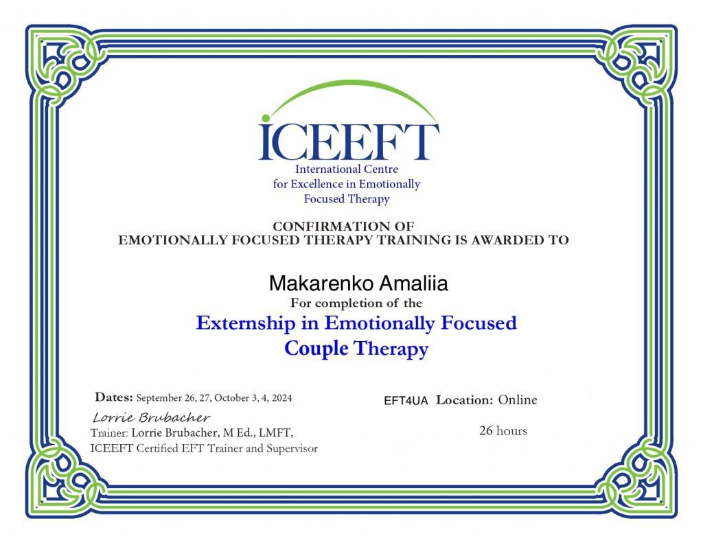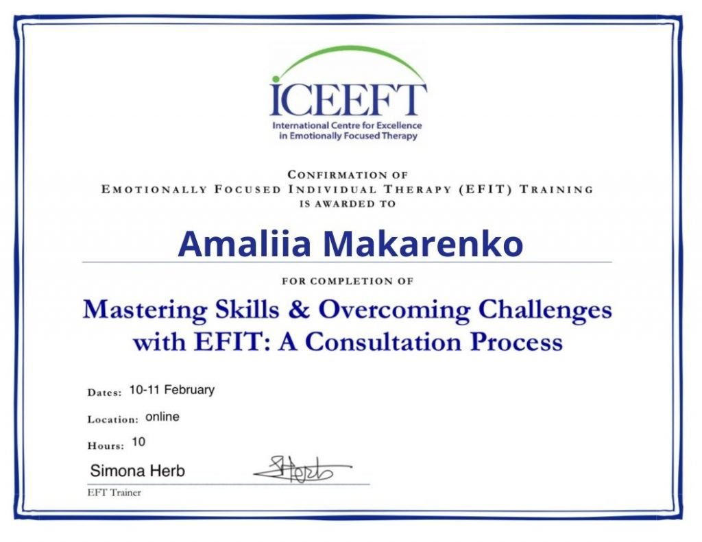 Я — доктор философии (PhD) в области клинической психологии, практикующая психологогиня и психотравматологиня. Моя профессиональная история продолжается с 2007 года. За это время я работаю с индивидуальными запросами и парами. Мой подход основан на доказательности, прозрачности и партнерстве. Я работаю в рамках когнитивно-поведенческой терапии (КПТ), эмоционально-фокусированной терапии (ЭФТ), многомерной психодинамической терапии травмы, использую протокол реконсолидации травматических воспоминаний (RTM), а также другие травмофокусированные подходы. Если возникает «бремя сомнений» в сложных клинических случаях я не несу его наедине, а разделяю его с опытными супервизорами. В работе и жизни внимательная, ответственная, последовательная и надежная.