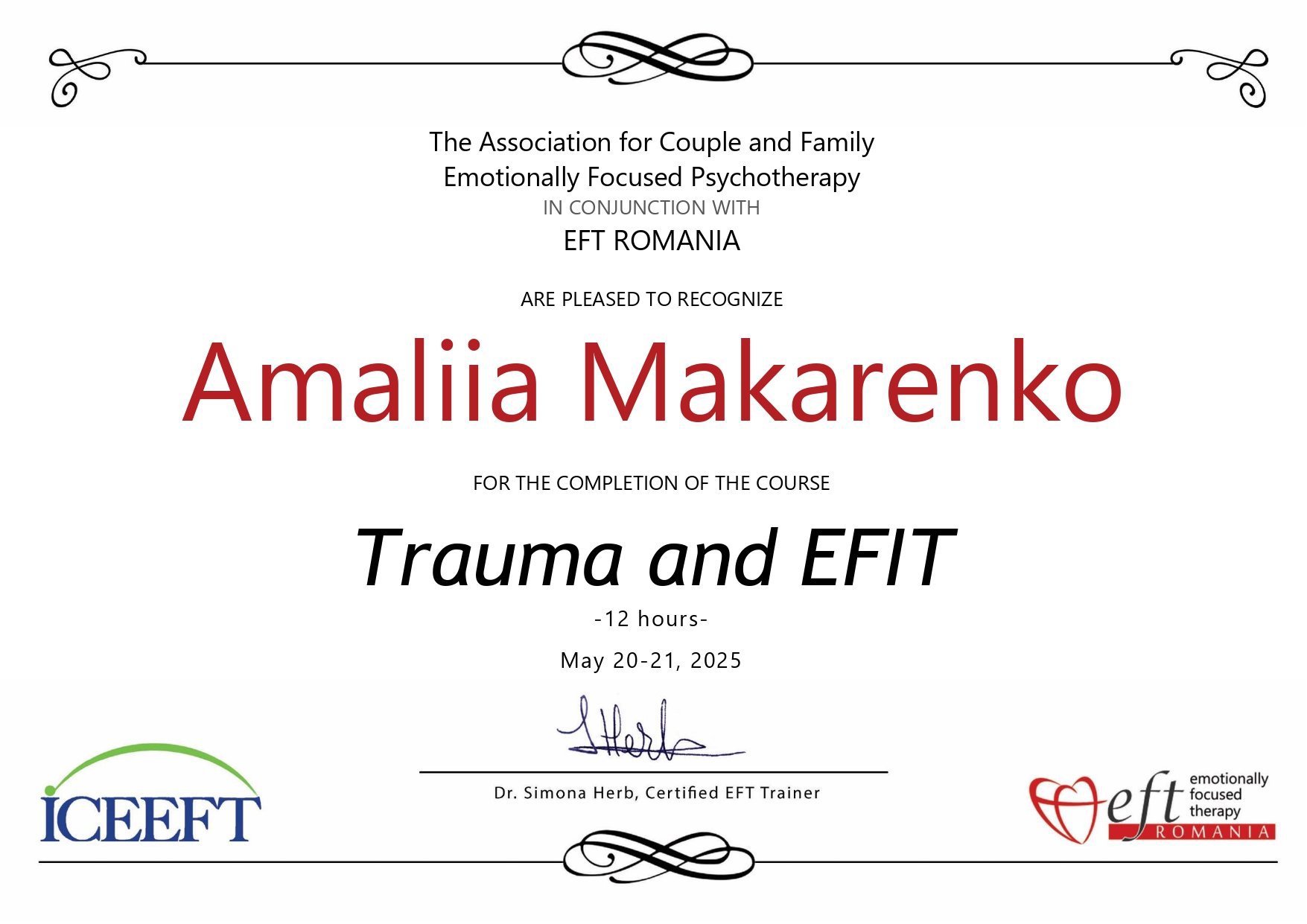 The Association for Couple and Family Emotionally Focused Psychotherapy in conjunction with EFT Romania