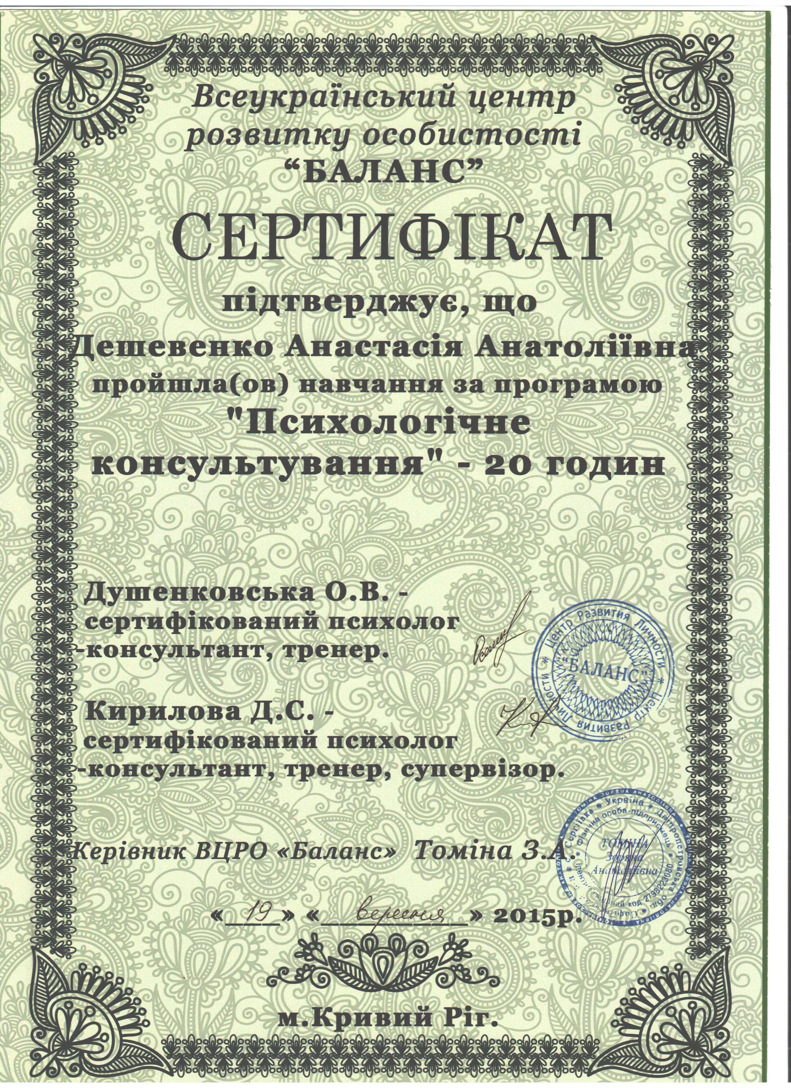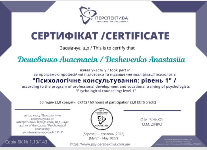 Государственное высшее обучающее учреждение "Криворожский национальный университет", специальность "Практическая психология" (2009-2014)