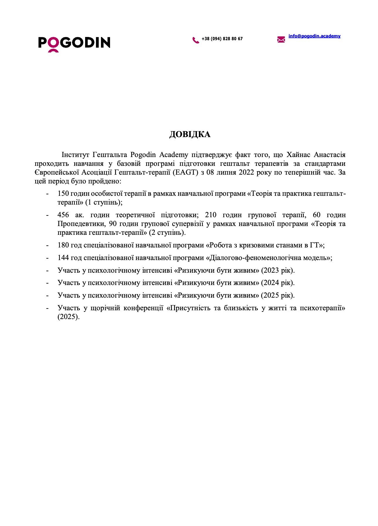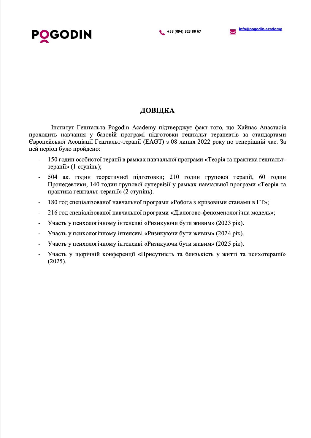 Учусь в Институте гештальта Pogodin Academy, завершила 1-ю степень гештальт-терапии и сейчас нахожусь на 2-й ступени (пошел 4 год обучения).