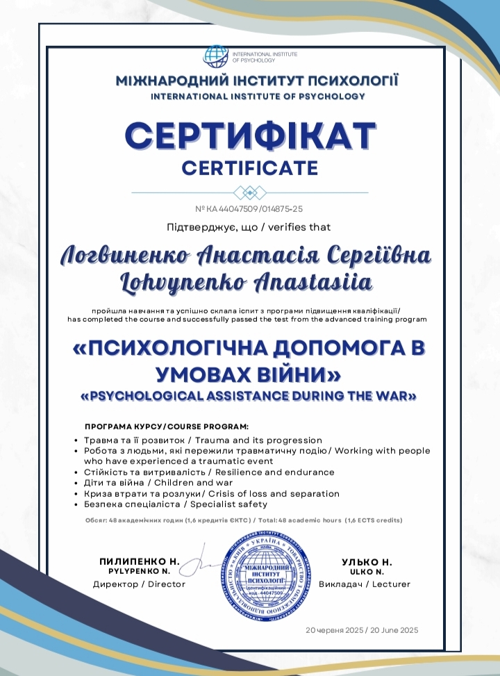 Разнообразие человеческой природы с детства и вдохновляло и шокировало. Глаза видели многие грани человеческой природы, которую хотелось понять. Поэтому в 2014 году окончила Международный институт глубинной психологии по специальности практический психолог, психоанализ. Прошла тренинговый анализ и стала членом УАП. За годы практической деятельности научилась формальным знаниям предоставлять содержание и убедилась, что отношения между клиентом и психотерапевтом являются условием положительных личностных изменений. Изучала различные методы психологии, такие как телесно-ориентированную терапию и арт-терапию, осваивая разные инструменты взаимодействия с внутренней вселенной личности.