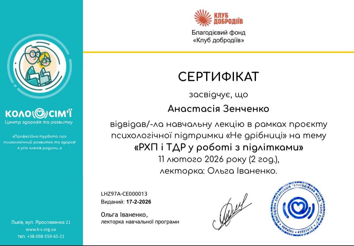 - вторая степень обучения в Киевском Гештальт Университете (408 часов).
