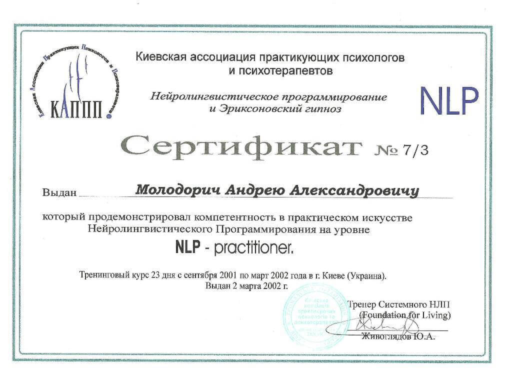 - мастер Нейро-Лингвистического Программирования (КАППП);
