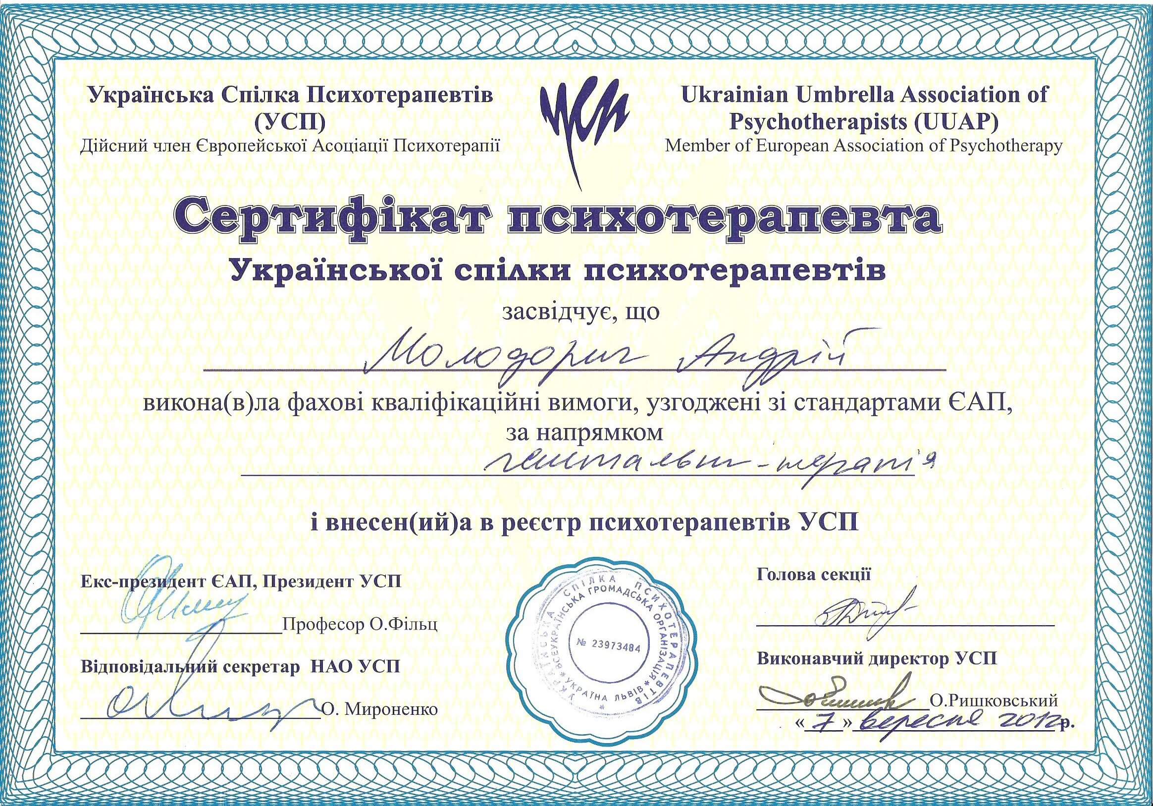 - член реестра психотерапевтов Украинского Союза Психотерапевтов;