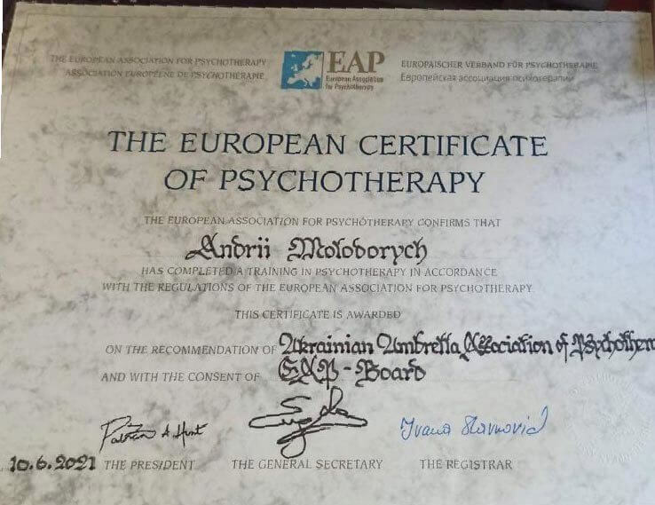 - почти супервизор (если бы не было войны уже сертифицировался) от Ассоциации Клиент-Центрированной Терапии Франции;