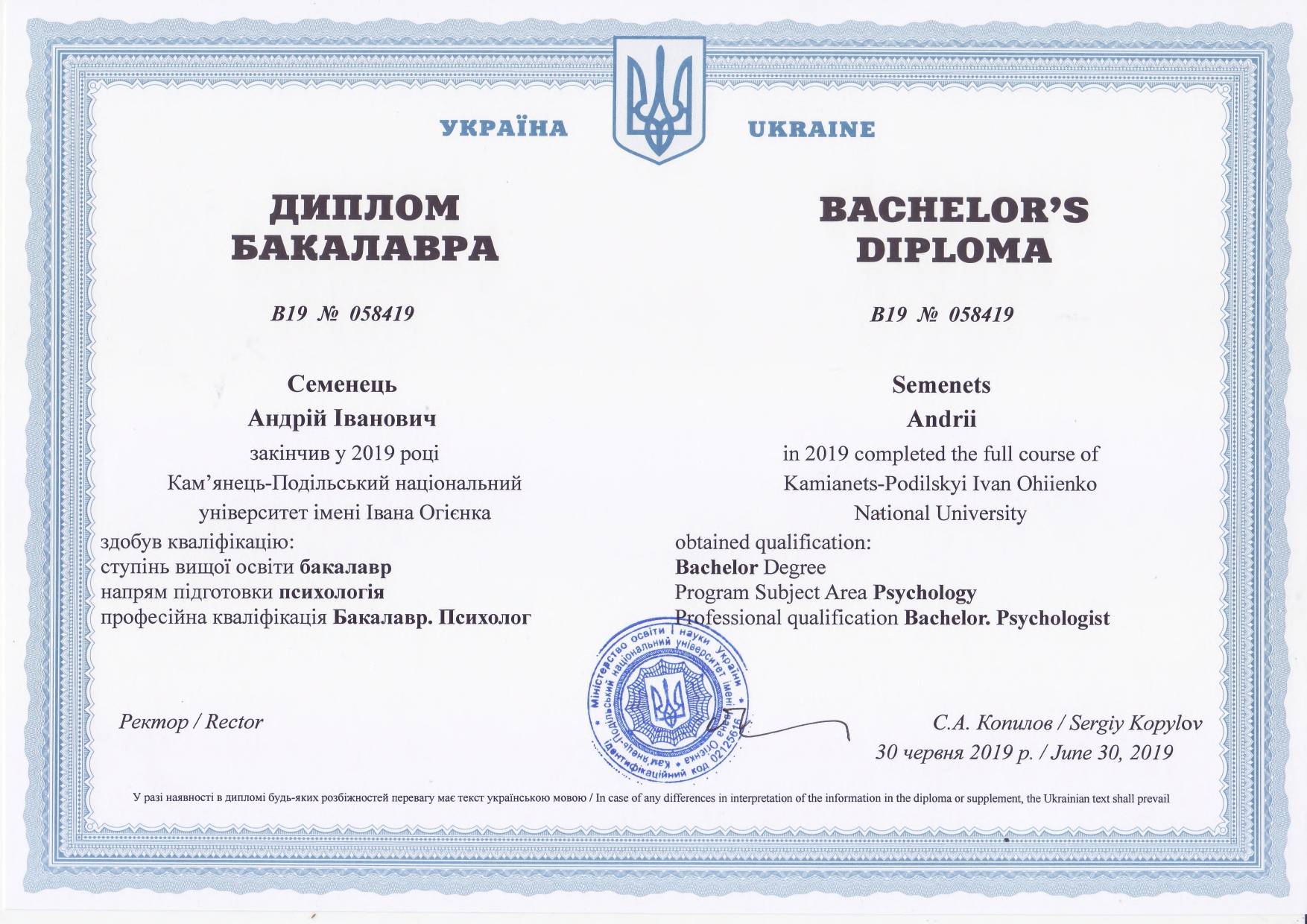В 2019 получил квалификацию Бакалавр по направлению 053 Психология КПНУ им. Ивана Огиенко