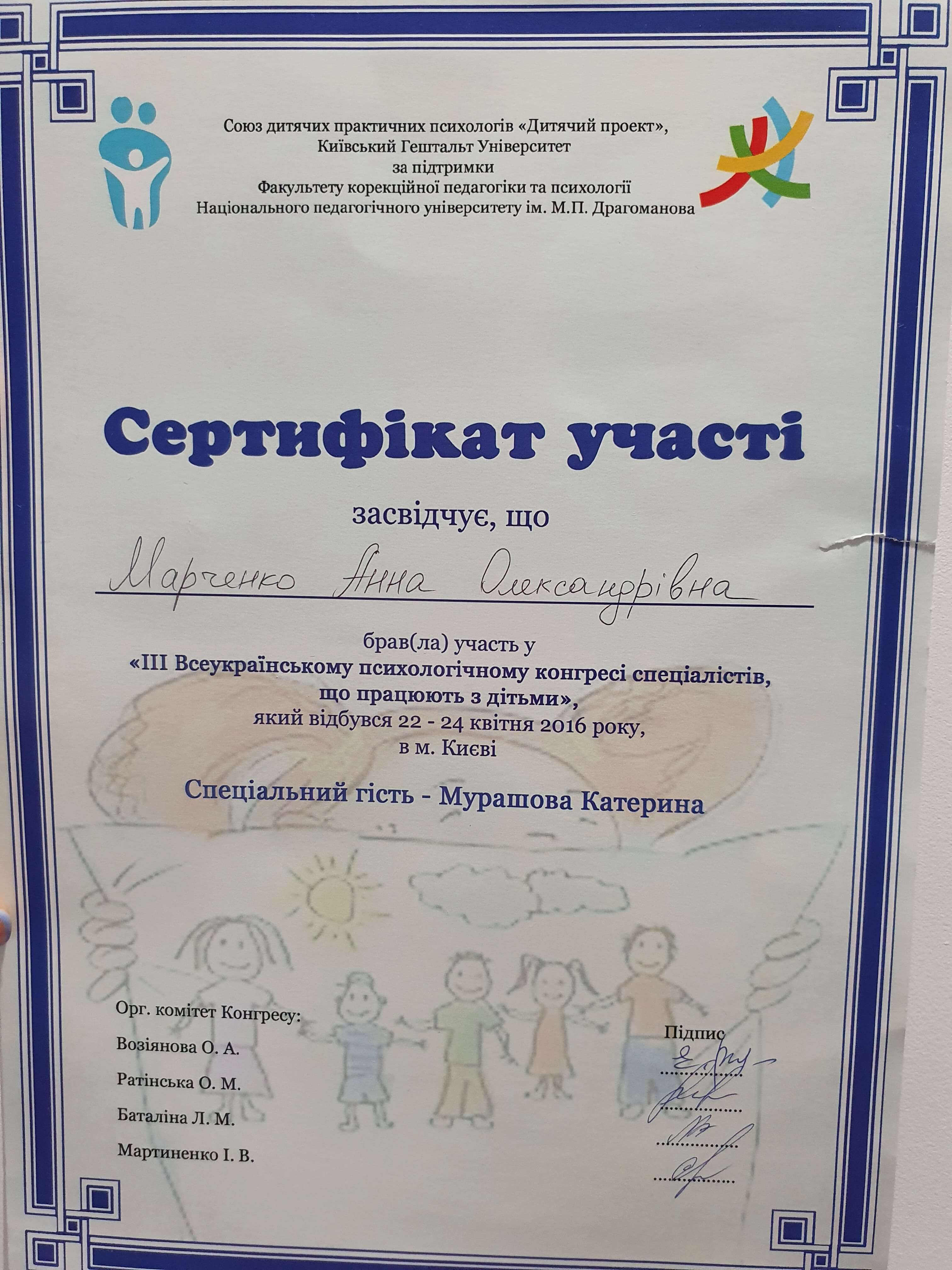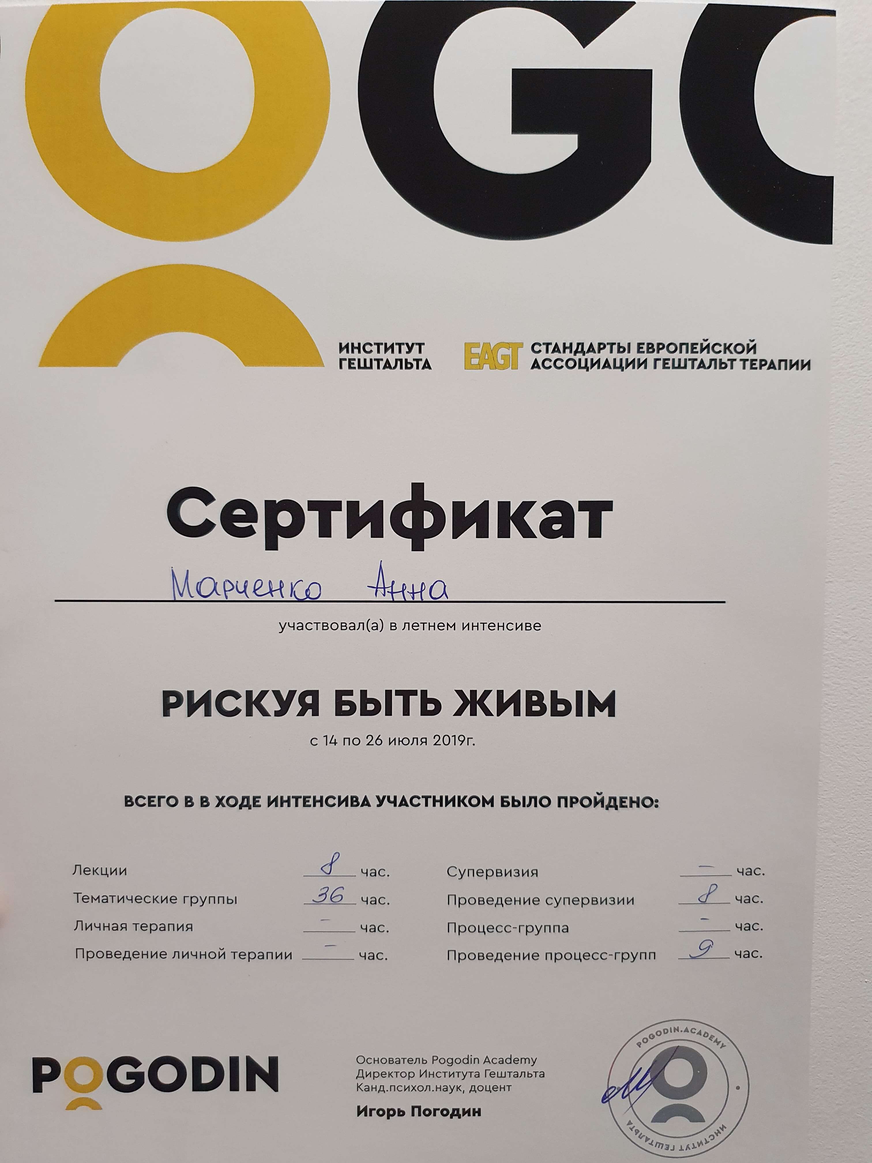 ОНПУ (специалист по социальной работе, психолог практик), МГИ (гештальт-терапевт), Pogodin Academy (супервизор)