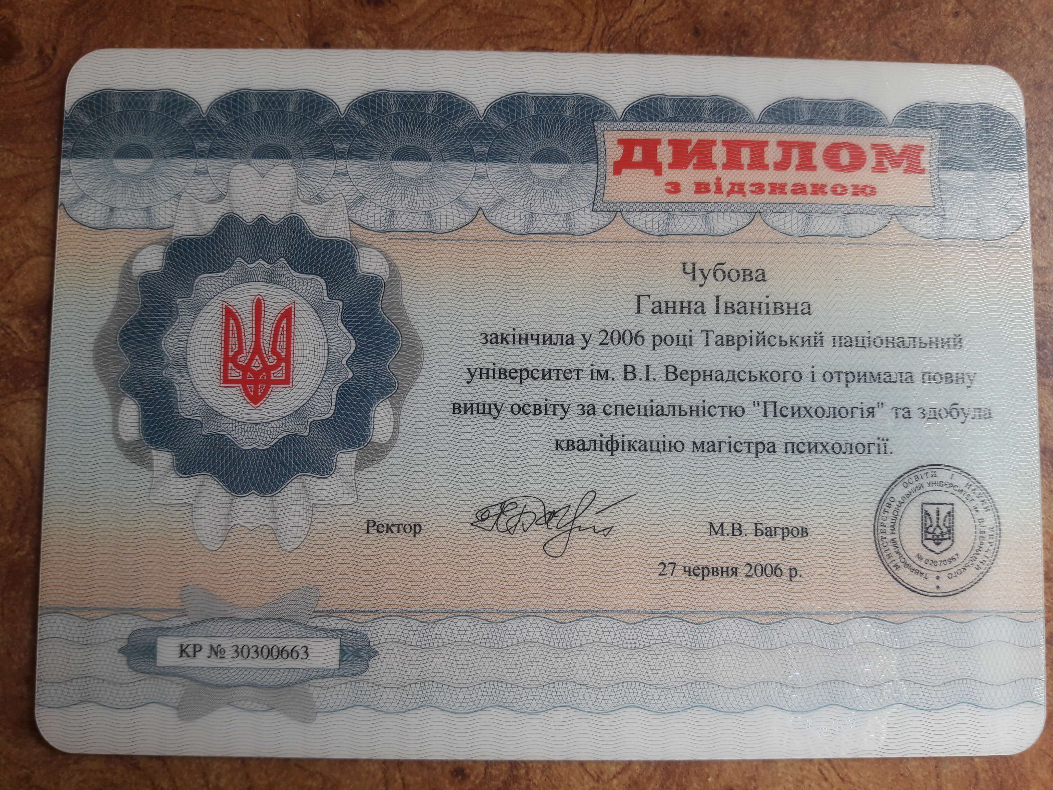 Чтобы стать профессионалом я достаточно много училась, проходила личную терапию и супервизию и продолжаю делать это до сих пор. Получила базовое психологическое образование (магистр психологии) на психологическом факультете ТНУ им. В.Н.Вернадского. В наступившем 2021 году заканчиваю обучение на гештальт-терапевта в Киевском Интституте Гештальта и Психодрамы и Московском Институте Гештальта и Психодрамы. Регулярно прохожу обучающие программы и семинары, углубляясь в свою профессию. Участвую в психологических конференциях в роли слушателя и спикера.