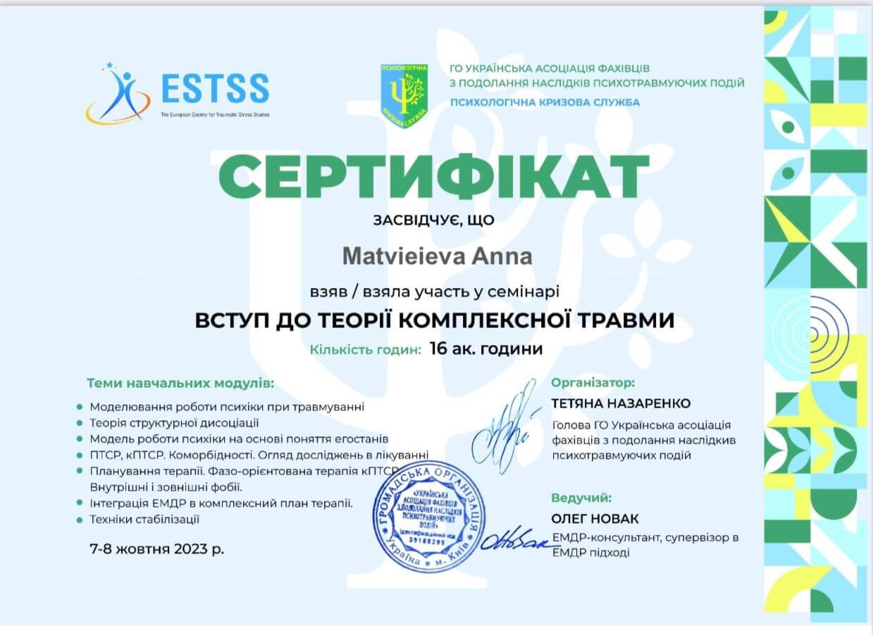 Спеціалізація по роботі з психологічними травмами і ПТСР, спеціалізація з психіатріі, спеціалізація по проективним методам психотерапії.