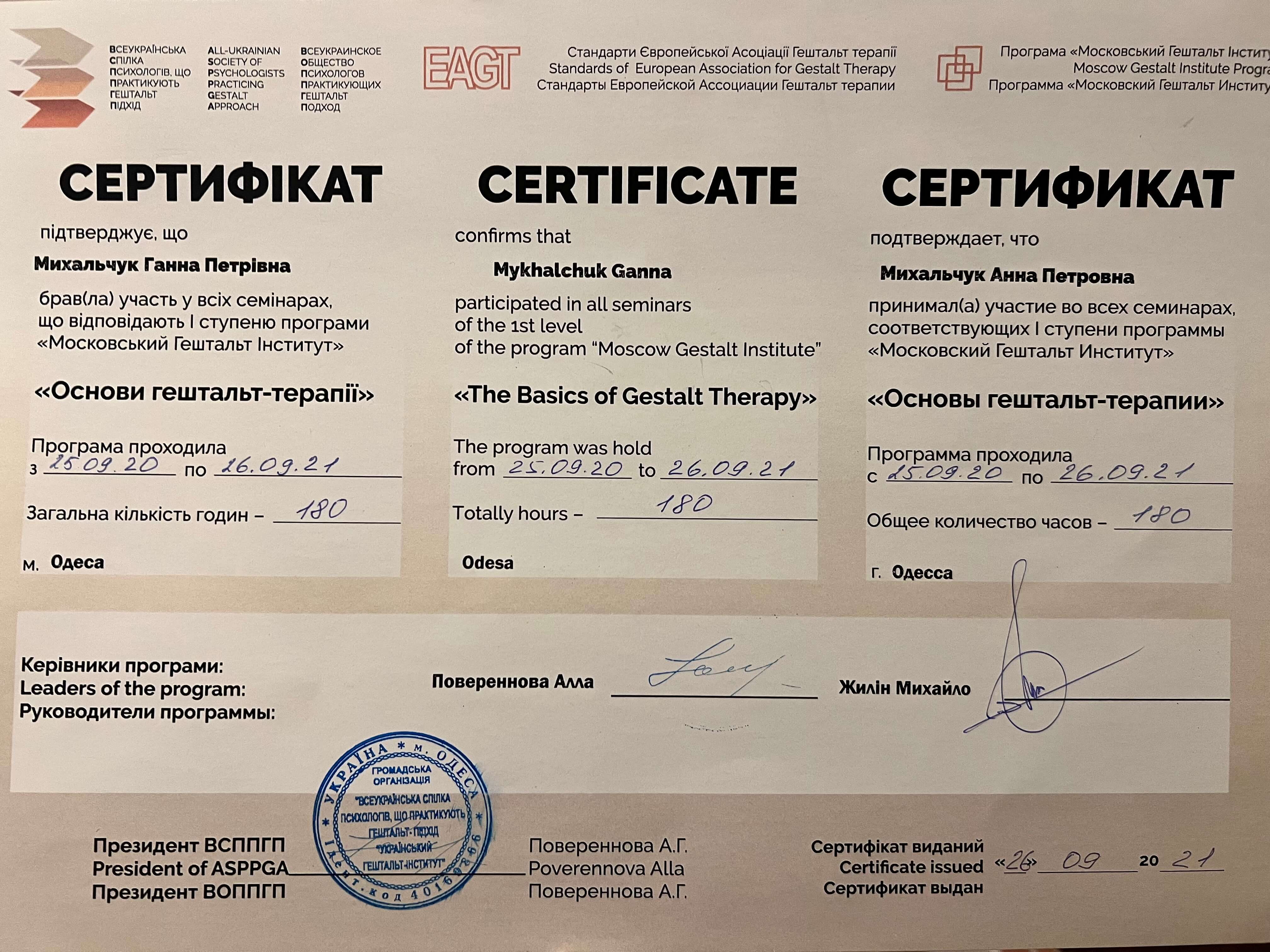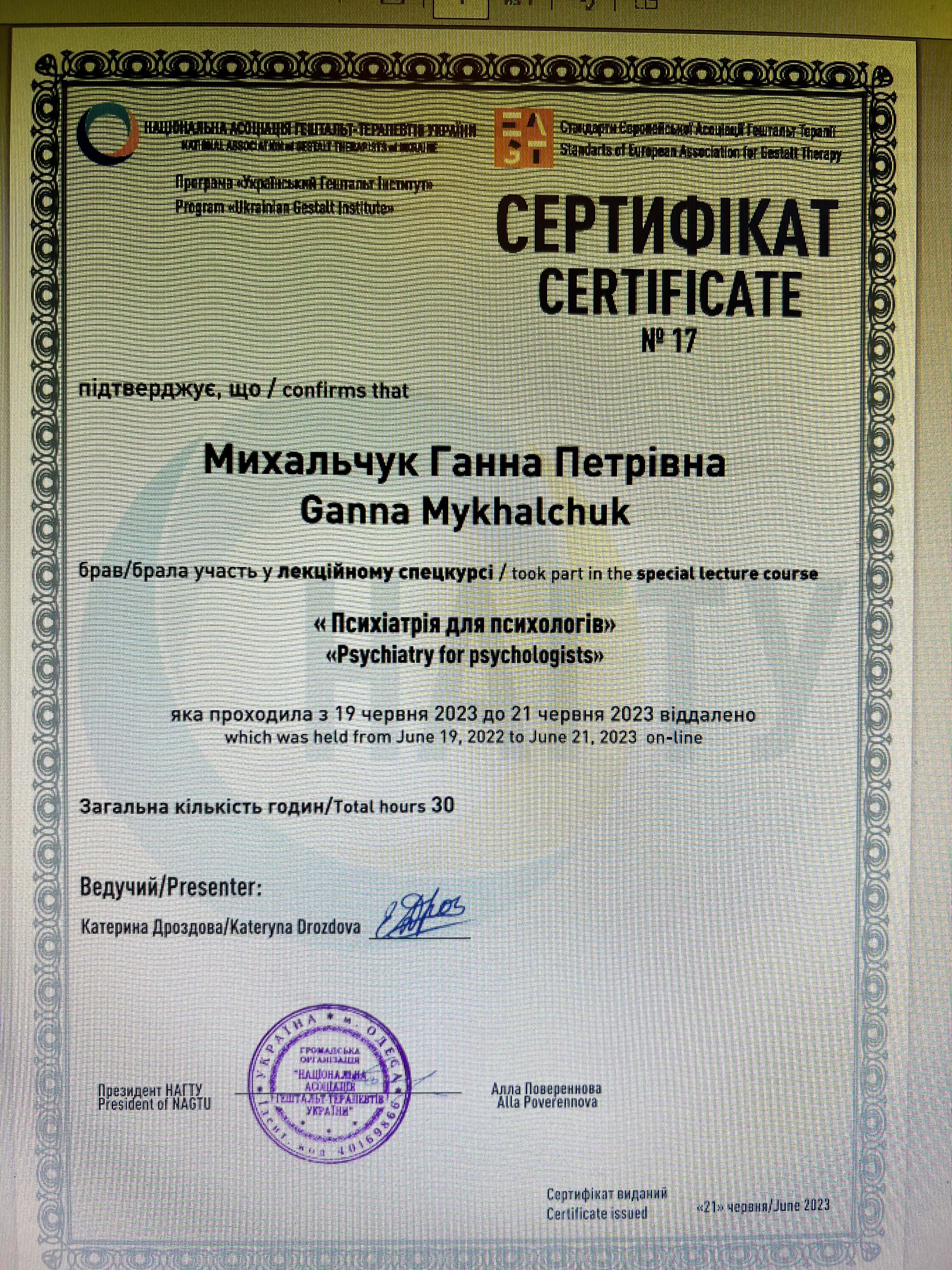 Заканчиваю магистратуру в Университете Болгарии (ЮЗУ). Учусь на 2 ступени Украинского гештальт-института. С 2022 года прохожу специализацию «Кризисы и травмы, теория развития и гештальт-подход»
