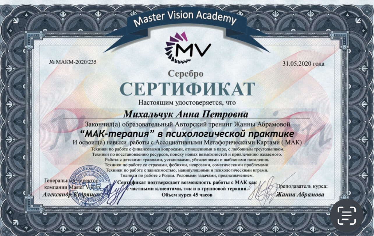 Закончила в 2020г. авторский курс Ж.Абрамовой «Мак-терапия в психологической практике»