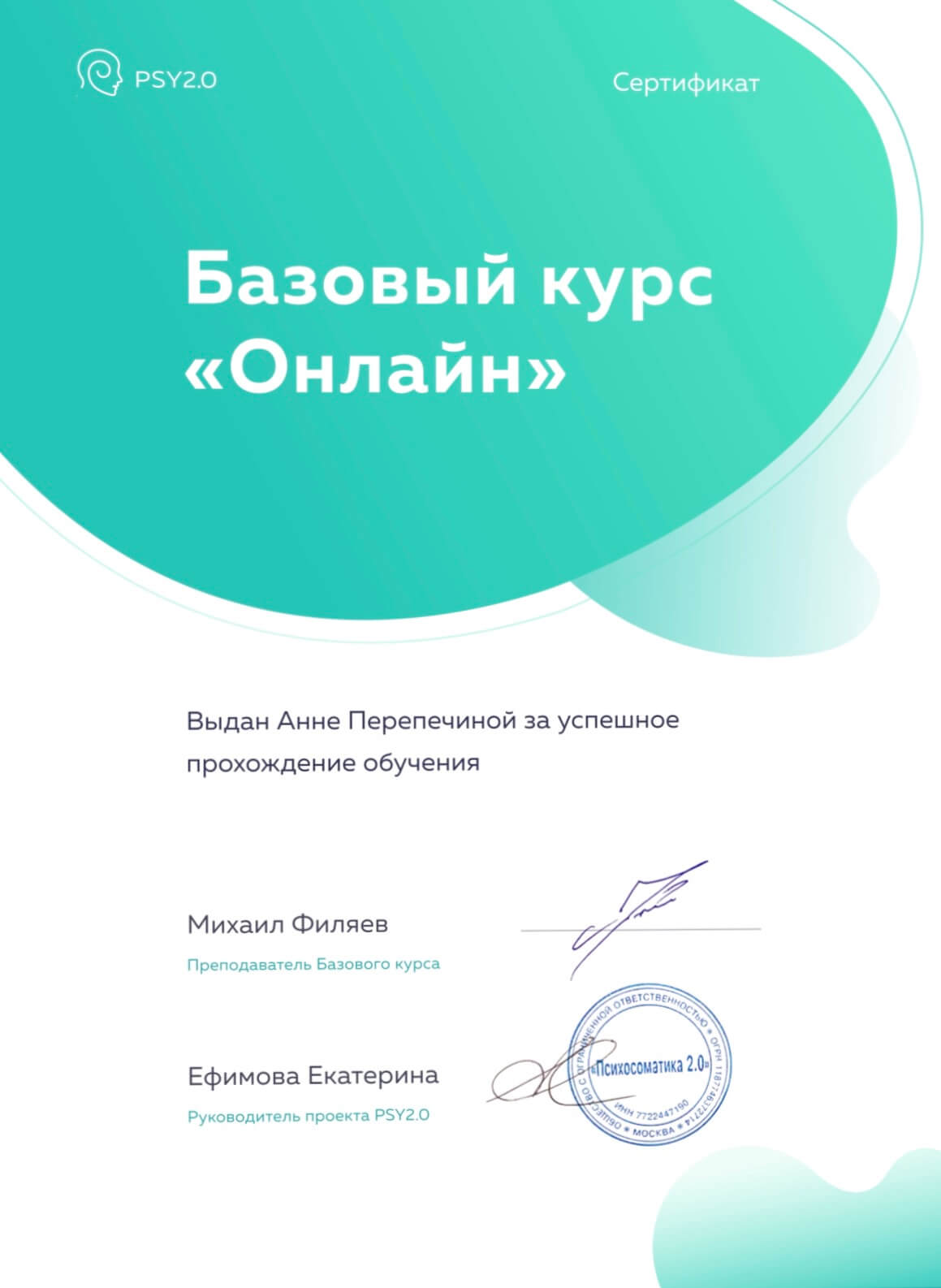 2020 – Базовый курс по психосоматике (проект psy2.0) – 96 часов М. Филяев;