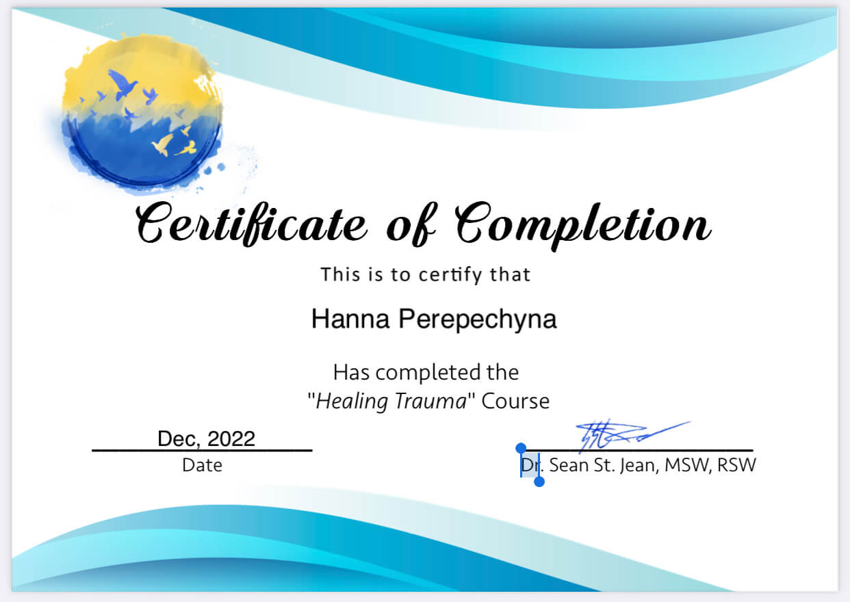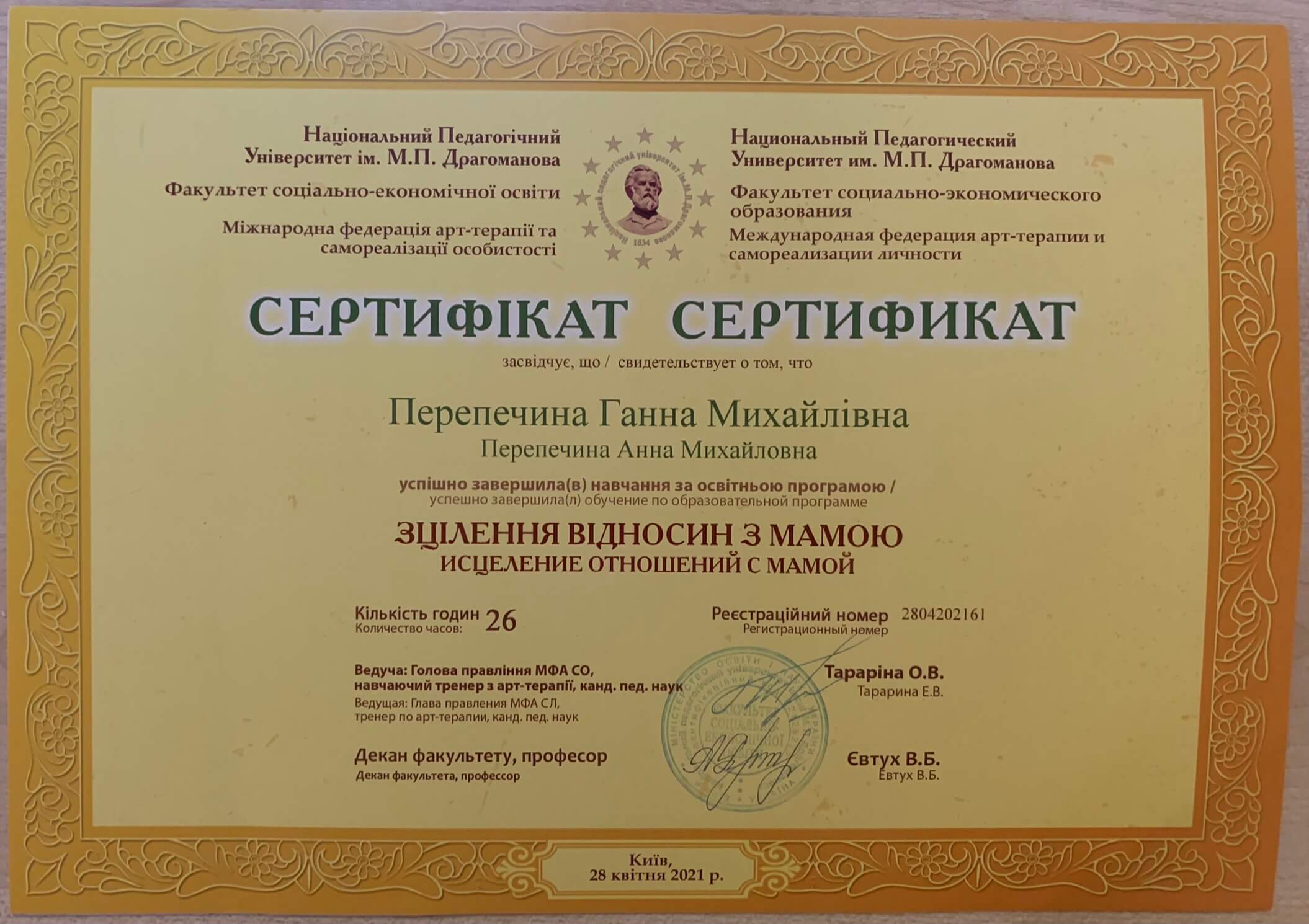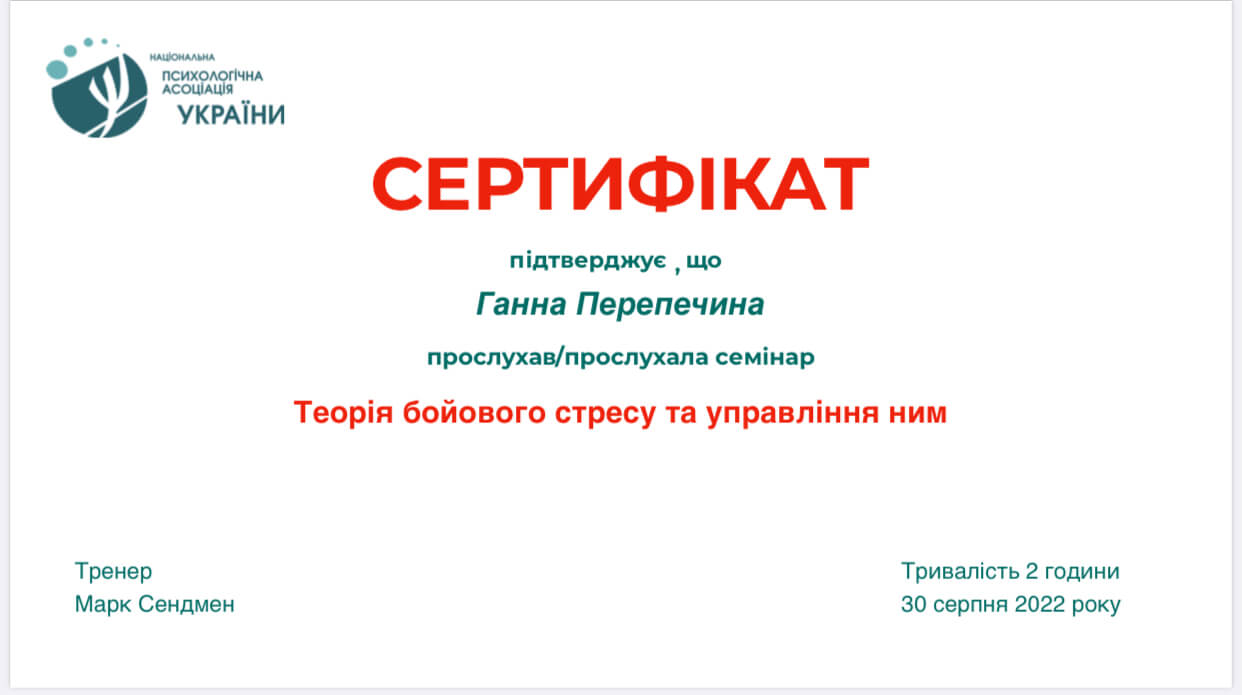 2021 – дистанционный курс «Расстройства психики и поведения. Основы психиатрической проподевтики» (центр общественного здоровья Минздрава Украины) – 10 часов