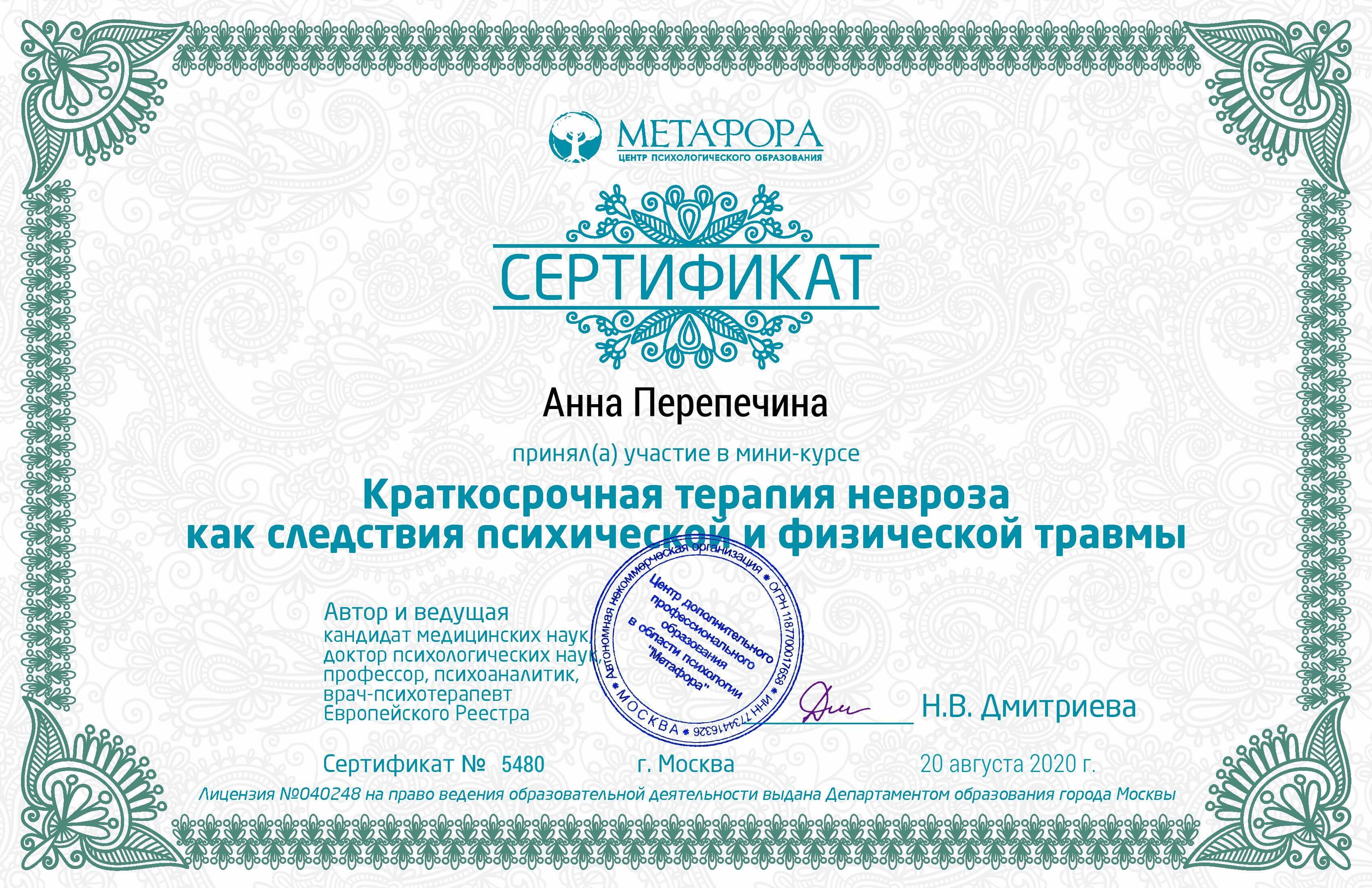 2020 – Мини-курс «Краткосрочная терапия невроза как последствия психической и физической травмы» (Центр Метафора) – 5 часов Н.В. Дмитриева