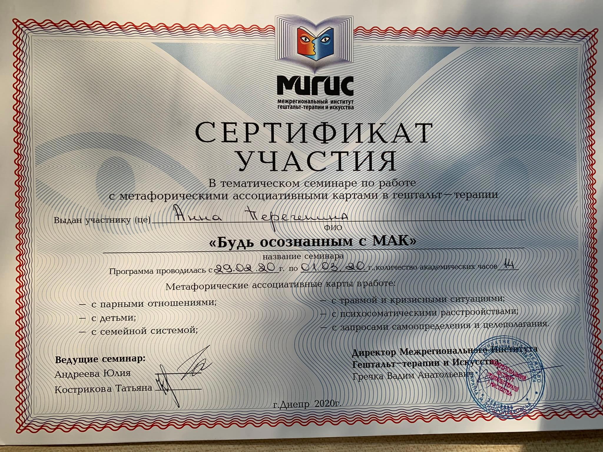 2019-2020 – Межрегиональный институт гештальт-терапии и искусства 1 степень – 120 часов под руководством Ю.С. Воробьева