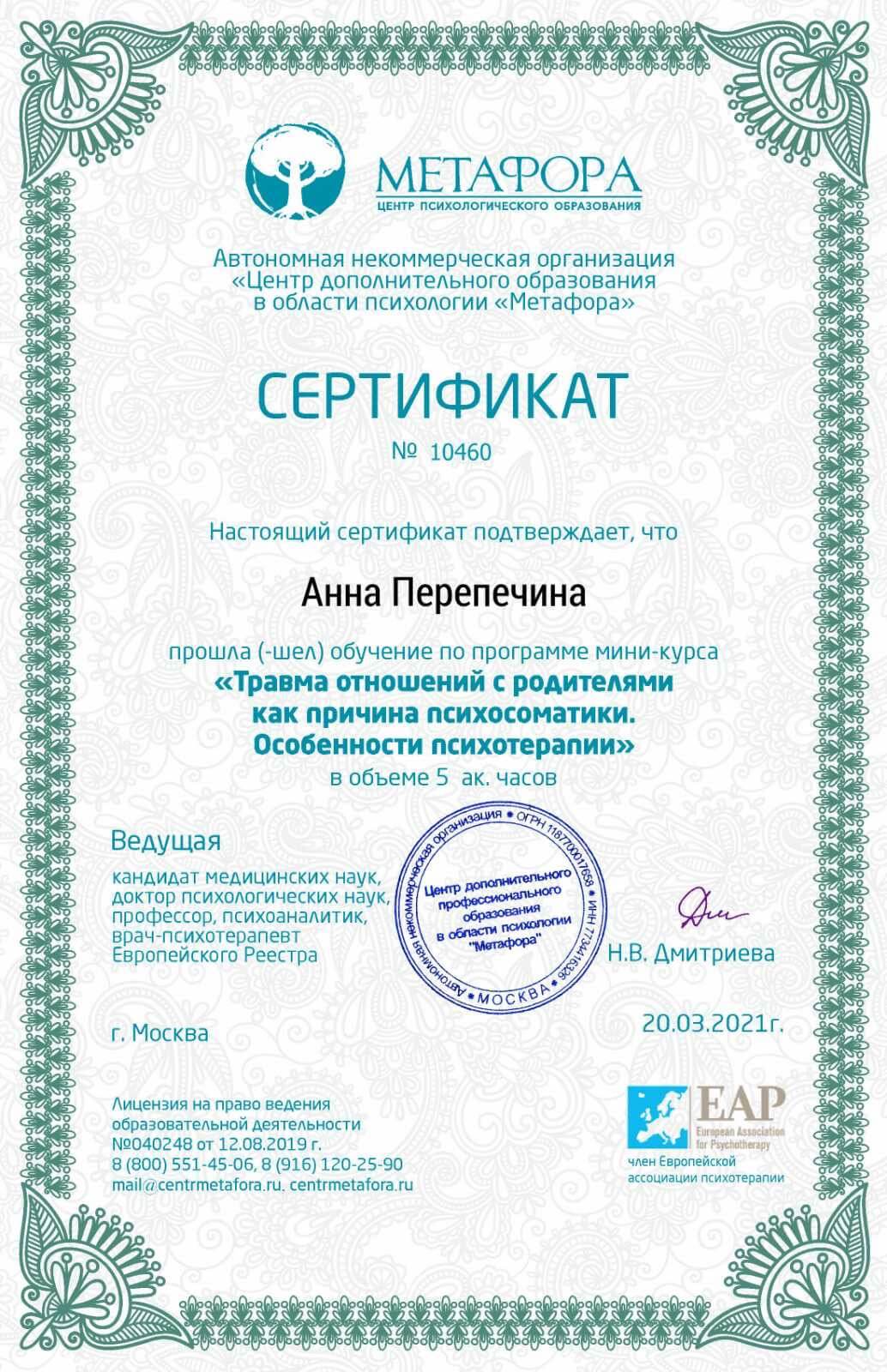 2021 – мини-курс «Травма отношений с родителями как причина психосоматики. Особенности психотерапии (центр Метафора) – 5 часов Н.В. Дмитриева