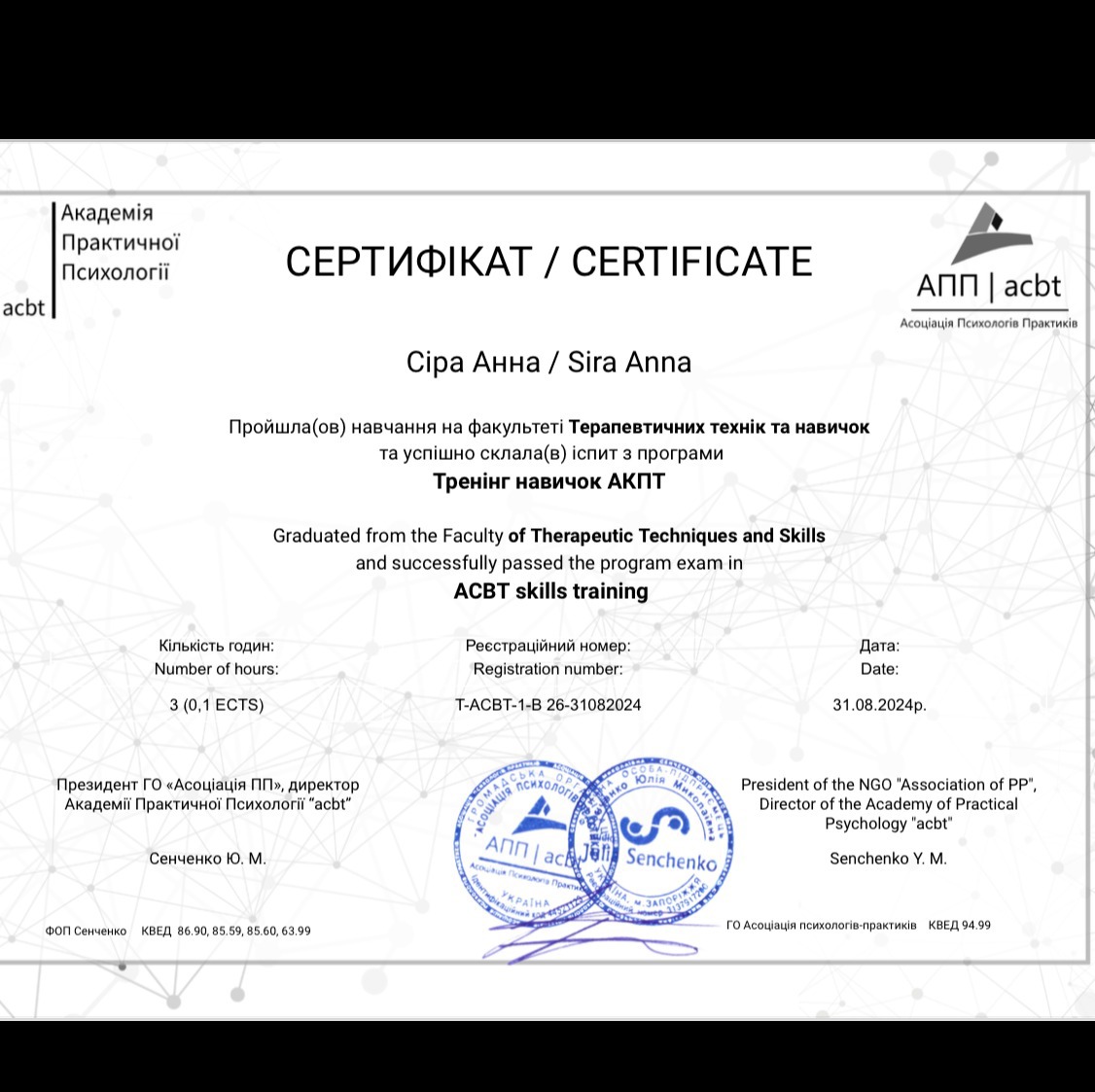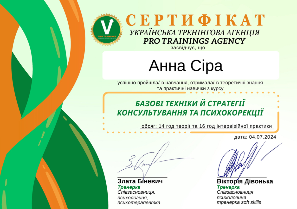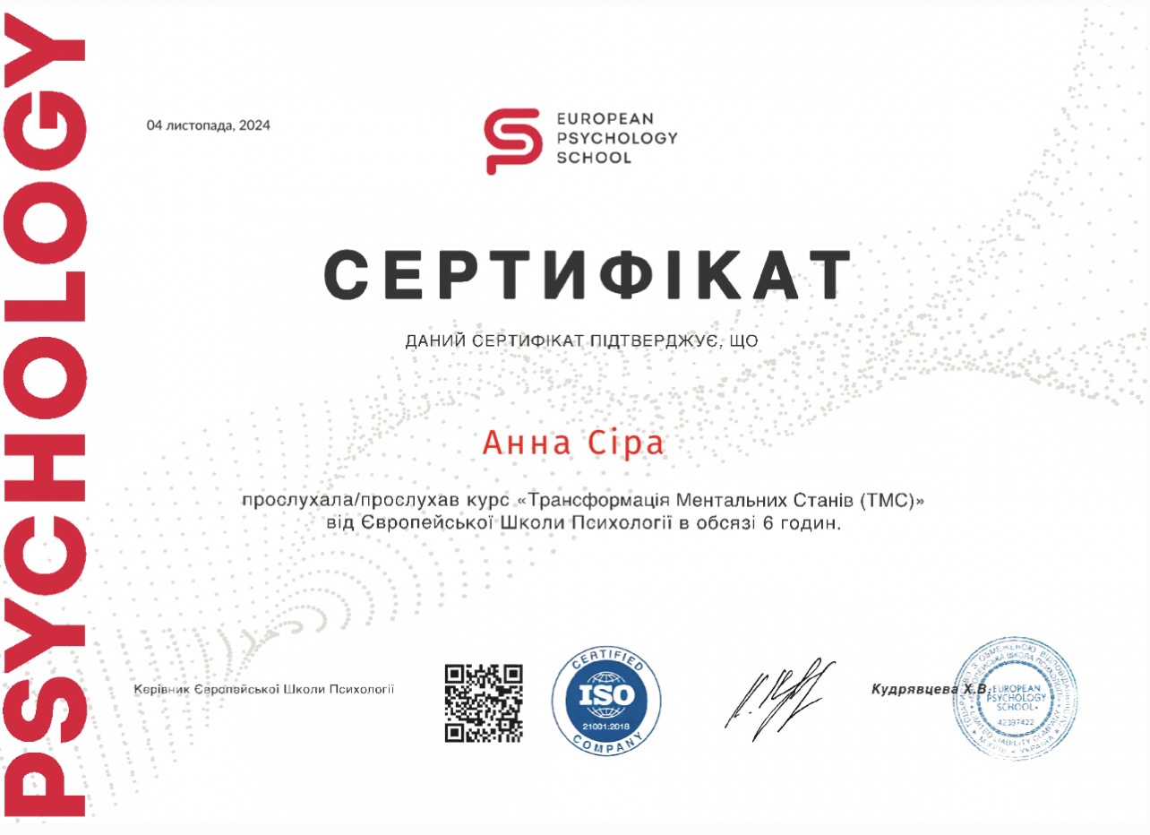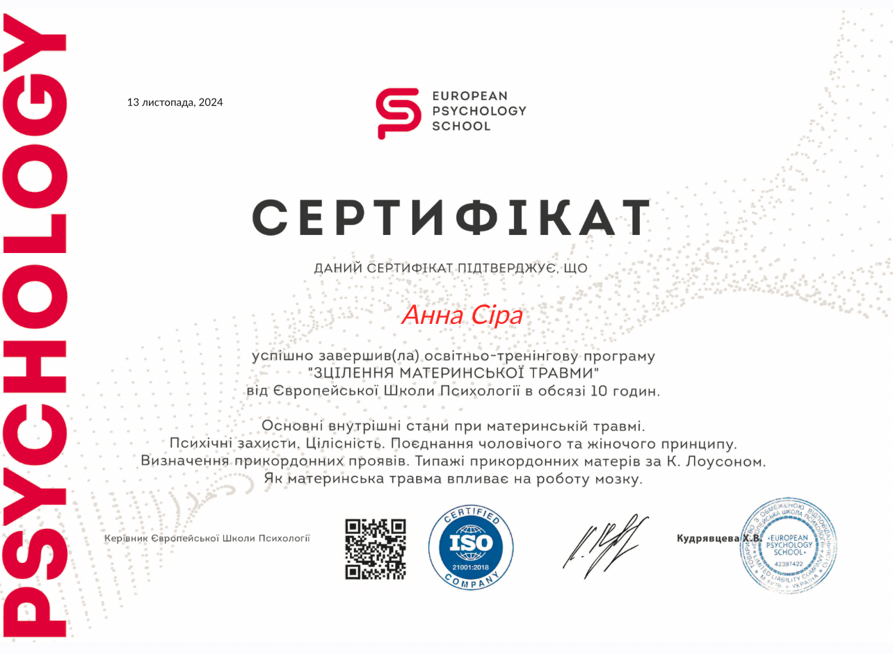 Окончила Нежинский Государственный Университет по специальности "Практическая психология", также имею сертификат Консультанта по Положительной психотерапии и другие кратковременные психологические курсы. Учусь в заведении последипломного образования Европейская школа психологии, у меня есть интервизионные и супервизионные встречи. Также начинаю обучение на психотерапевте.