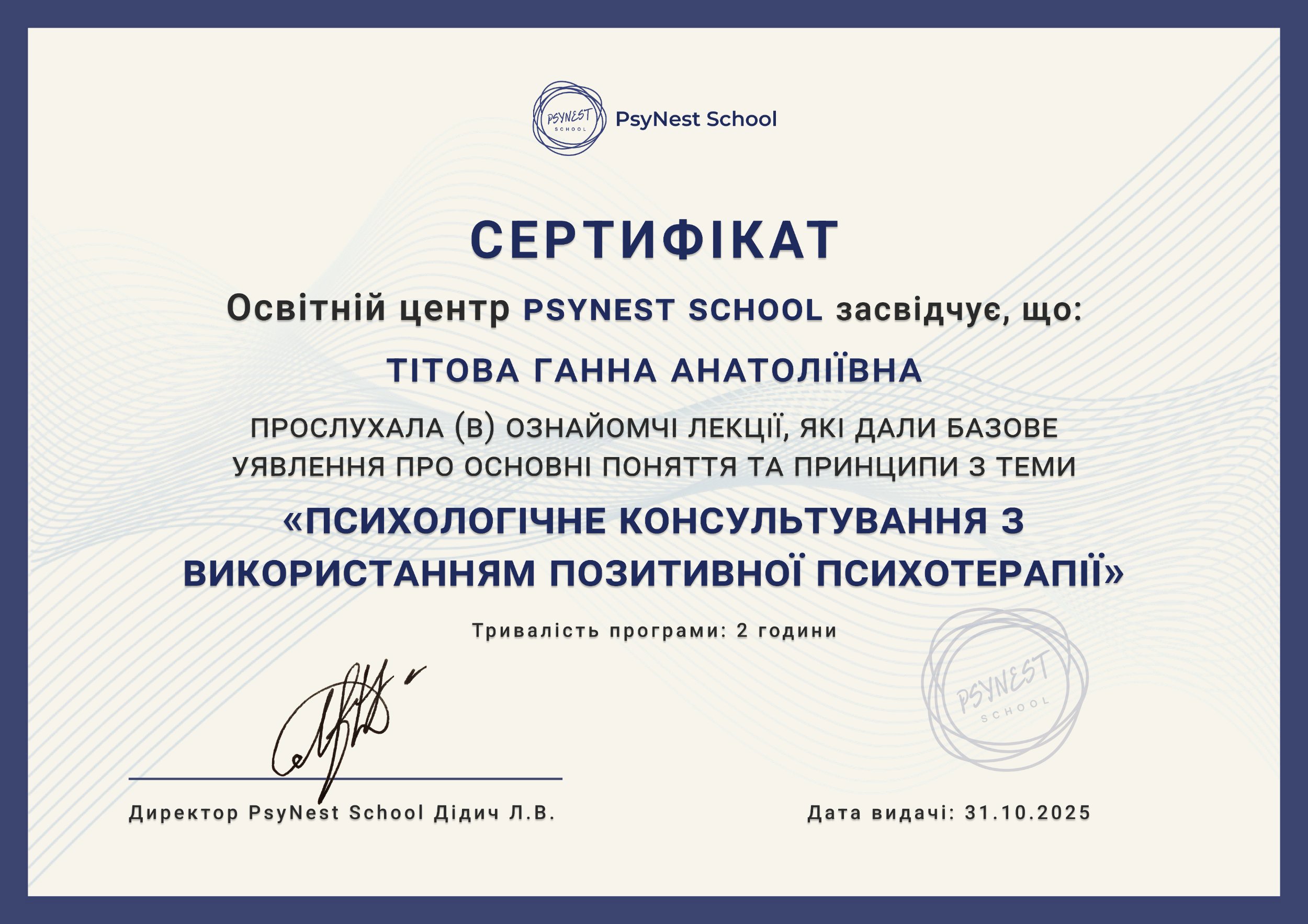 ОЗНАЙОМЧІ ЛЕКЦІЇ, ЯКІ ДАЛИ БАЗОВЕ УЯВЛЕННЯ ПРО ОСНОВНІ ПОНЯТТЯ ТА ПРИНЦИПИ З ТЕМИ «ПСИХОЛОГІЧНЕ КОНСУЛЬТУВАННЯ З ВИКОРИСТАННЯМ ПОЗИТИВНОЇ ПСИХОТЕРАПІЇ»