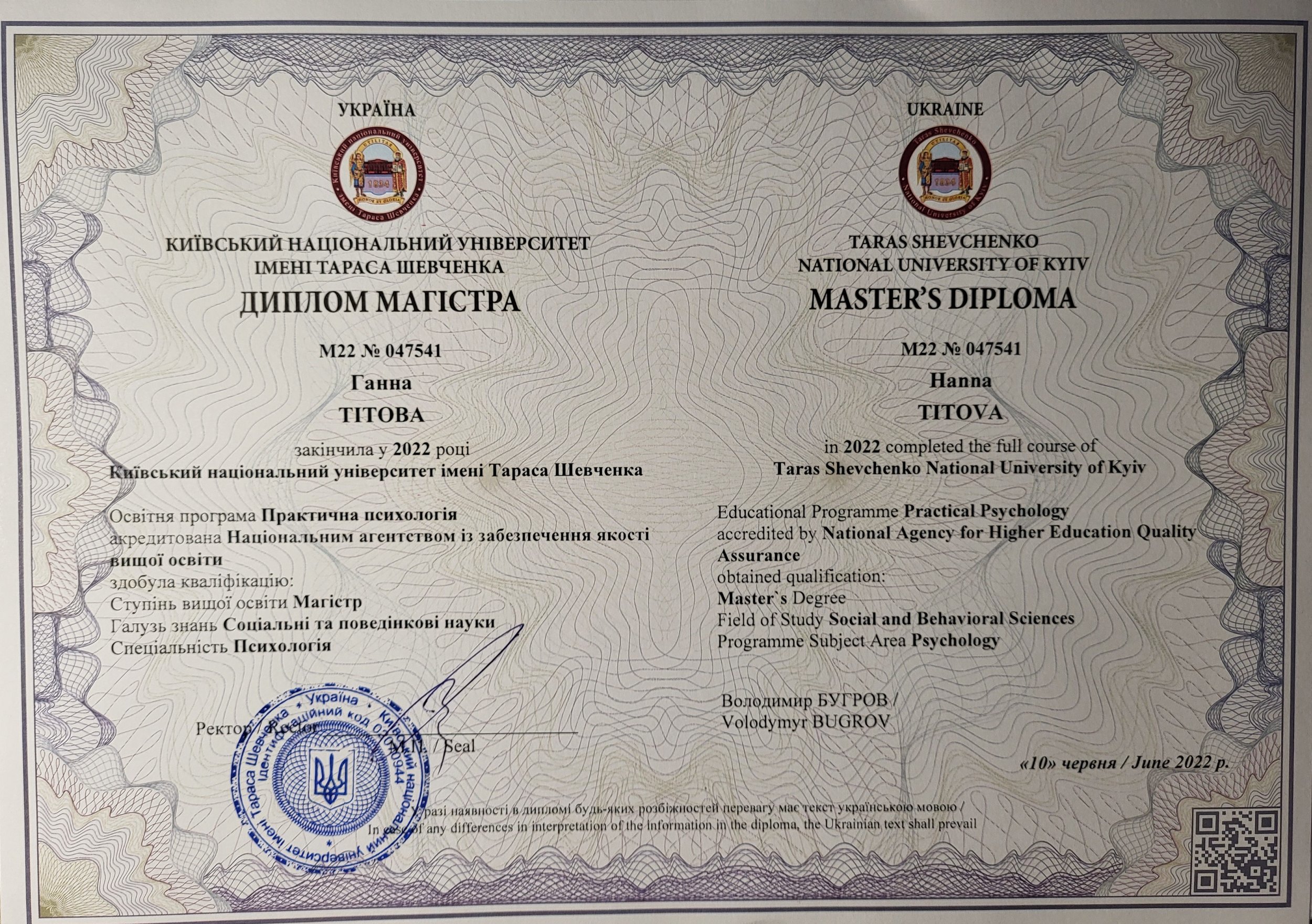 Киевский национальный университет имени Тараса Шевченко (магистр практической психологии).