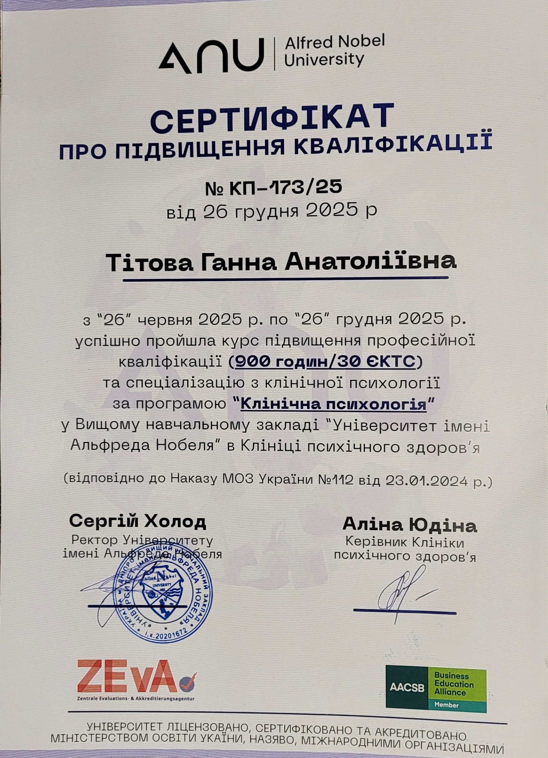 Курс повышения квалификации "Клиническая психология", Университет имени Альфреда Нобеля.