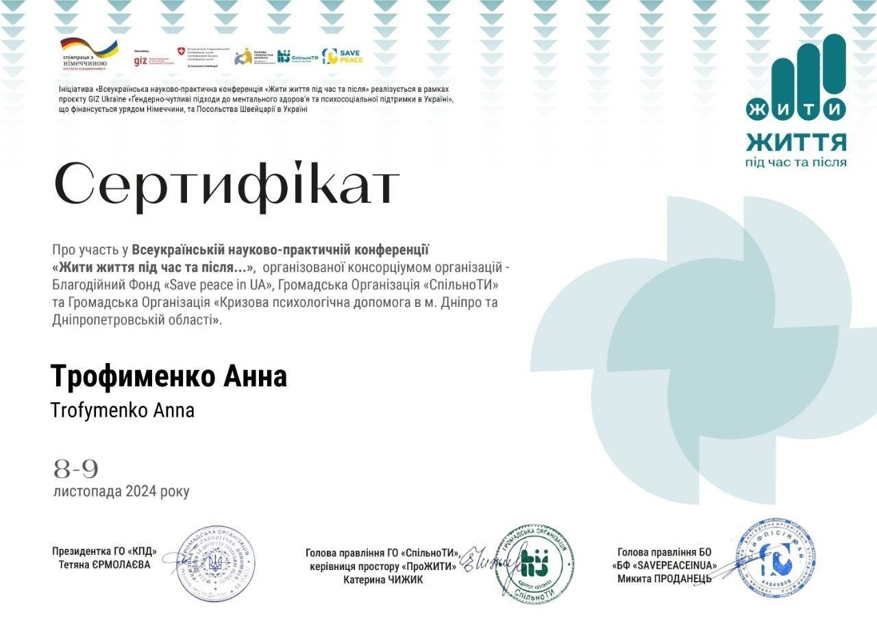 Благодійний Фонд «Save peace in UA», Громадська Організація «СпільноТИ», Громадська Організація «Кризова психологічна допомога в м. Дніпро та Дніпропетровській області»