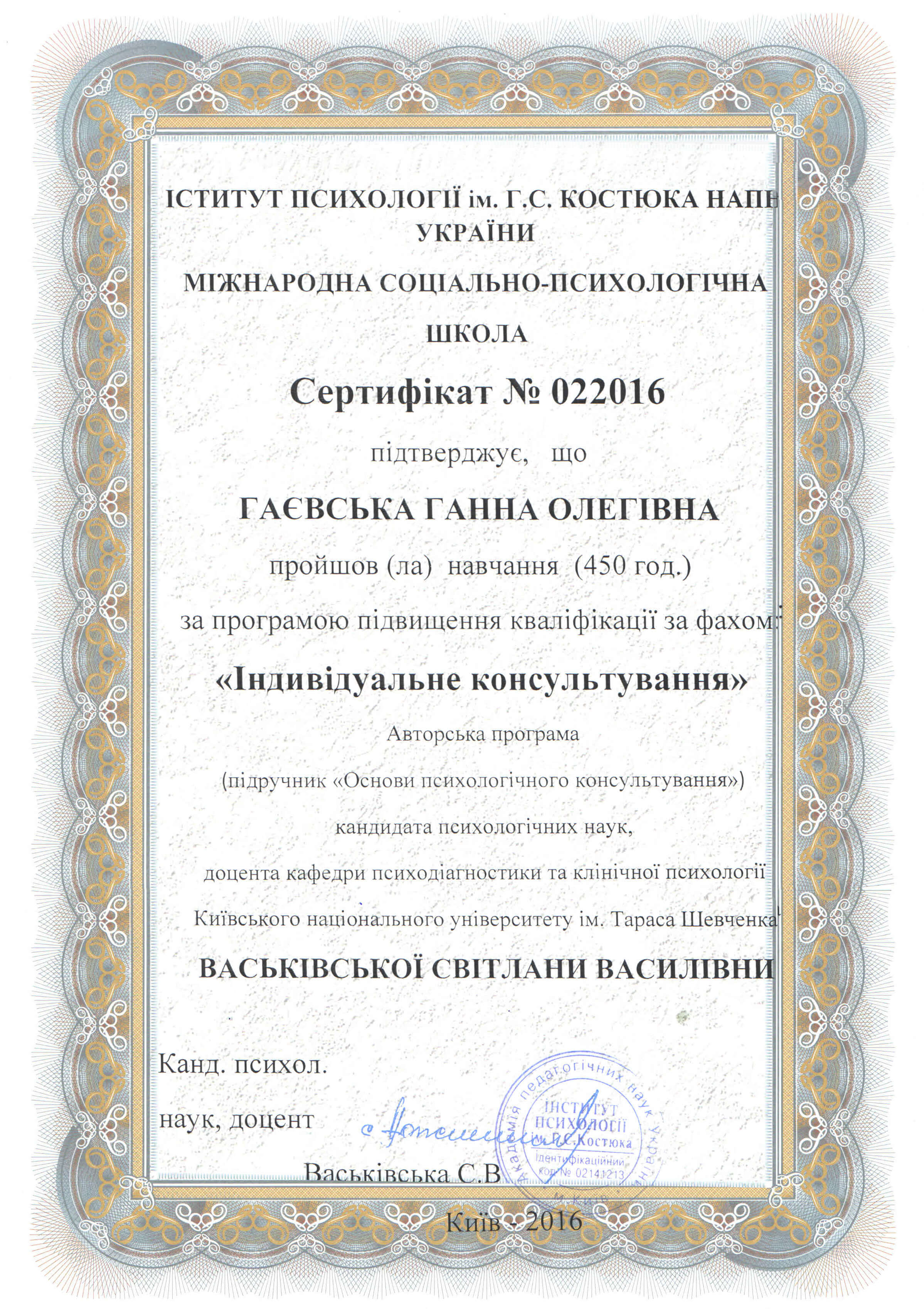 – Институт психологии им. С. Костюка АПН Украины, Международная социально-психологическая школа – повышение квалификации по специальности «Индивидуальное консультирование».