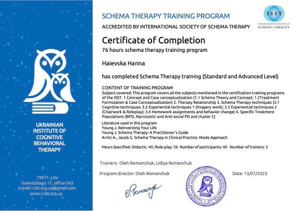 -Украинский институт cognitive behavioural therapy- Schema Therapy Training Program. 2023.