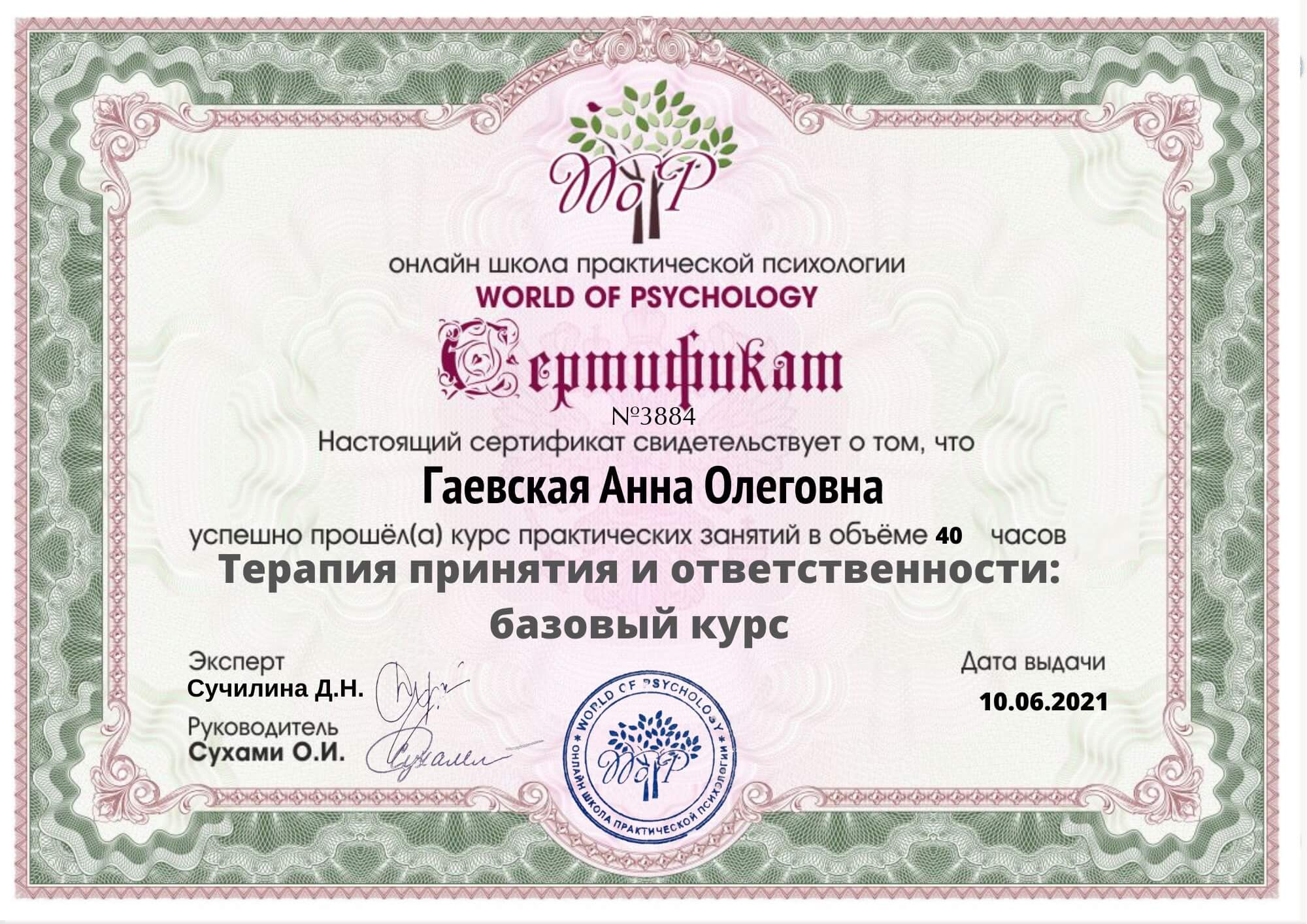 Сертификат участия в семинаре «Работа с обсессивно-компульсивным расстройством в ACT. 2021