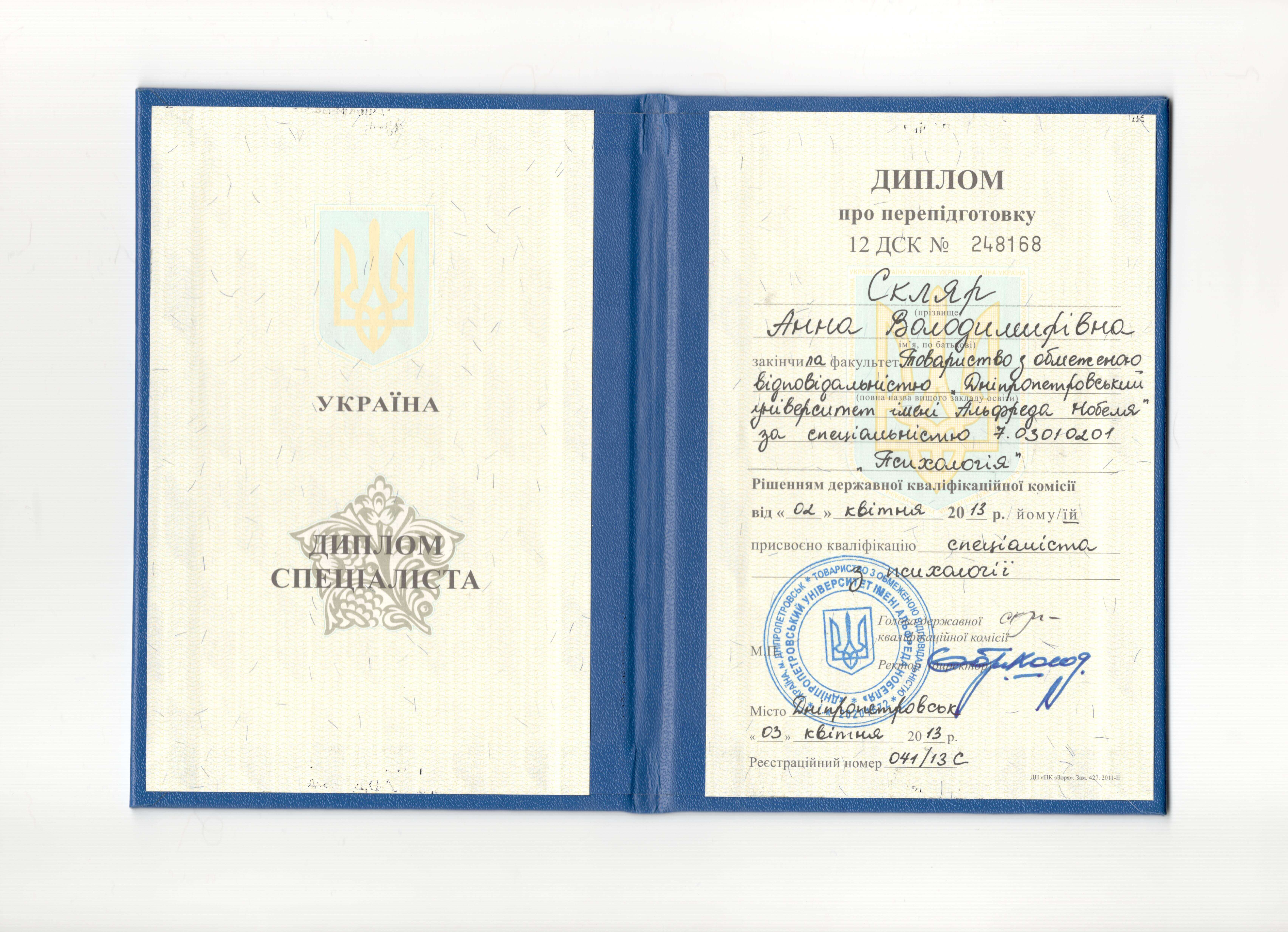 Высшее образование - Психолог (Днепропетровский университет имени Альфреда Нобеля: 2011-2013). Также имею второе высшее образование и степень доктора философии Phd.