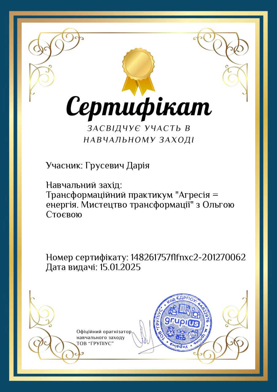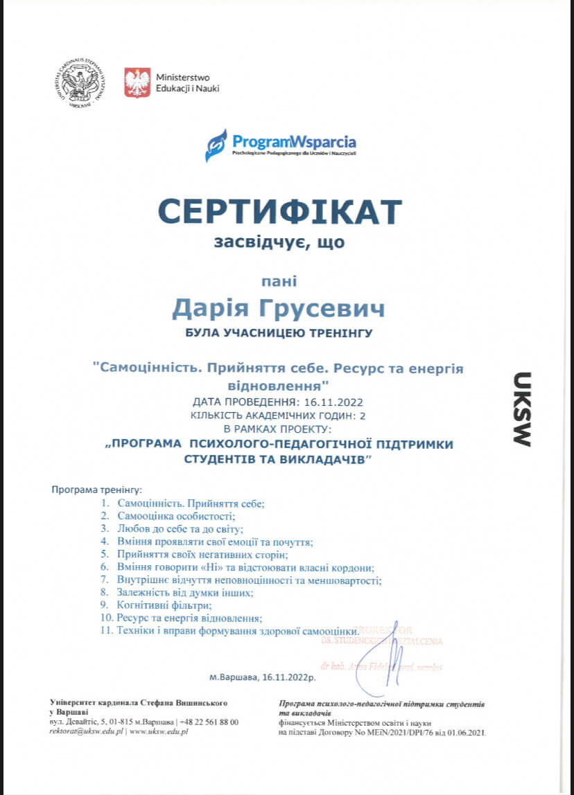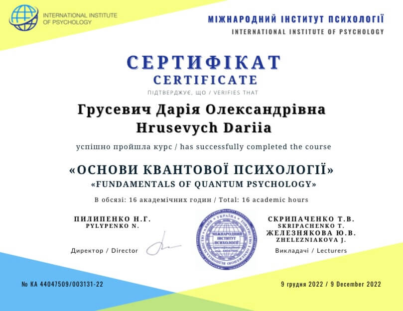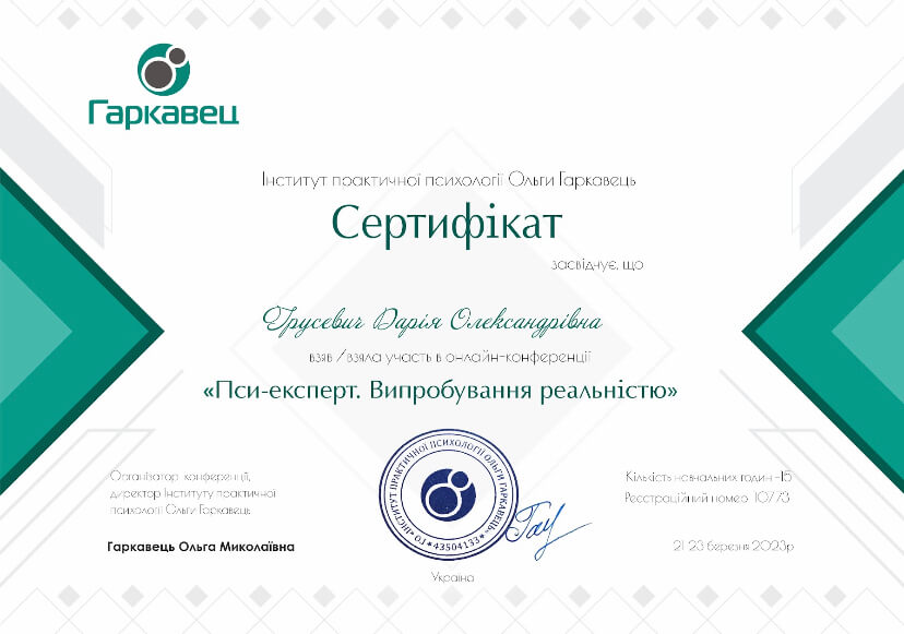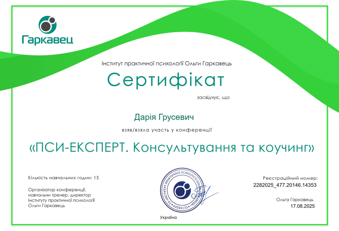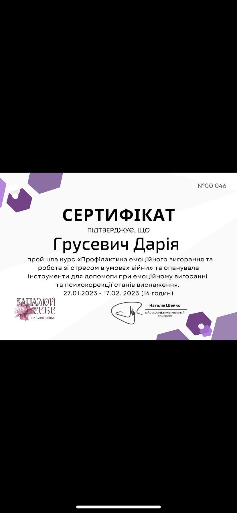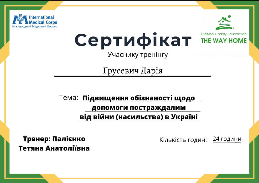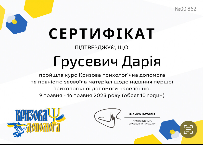 прошла курс «Профилактика эмоционального выгорания и работа со стрессом в условиях войны» (14 часов) и «Кризисная психологическая помощь» (10 часов) у военного психолога Наталии Шейко.