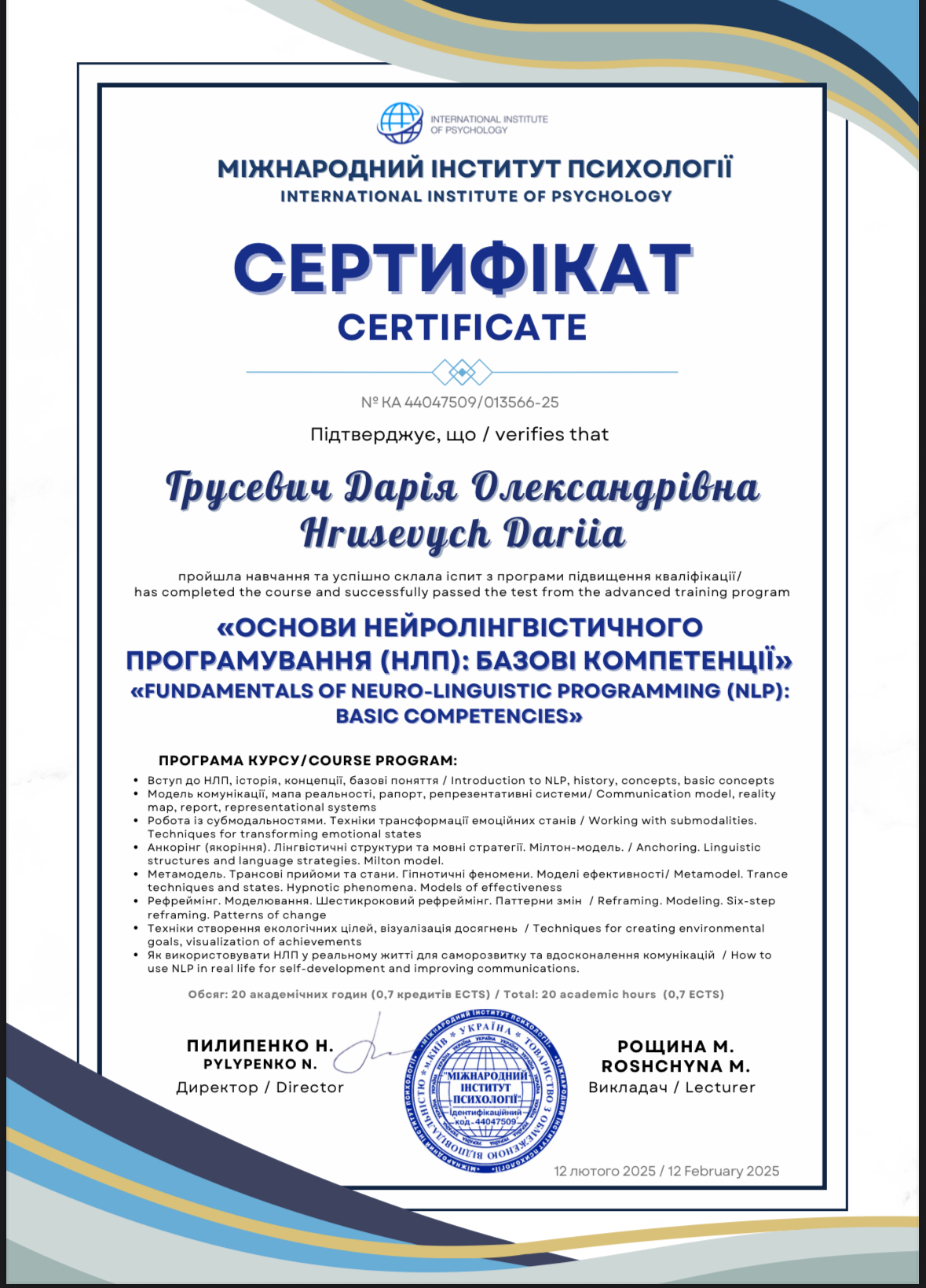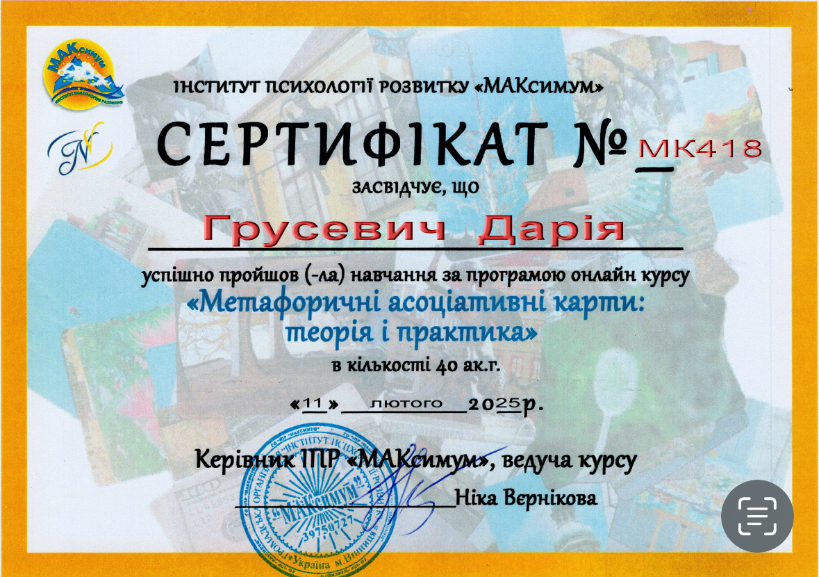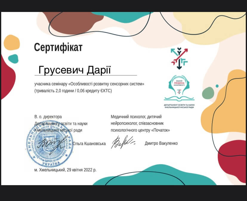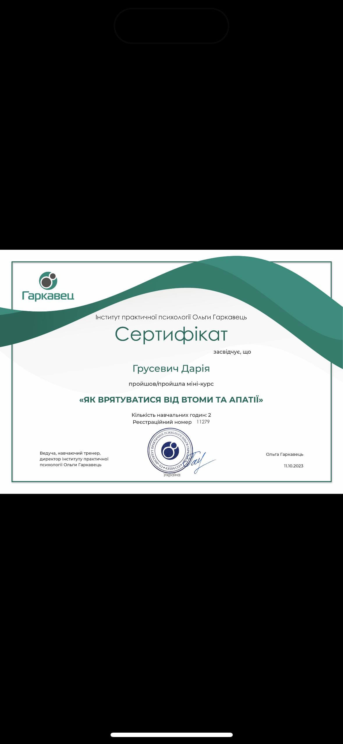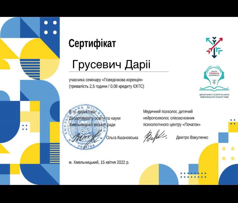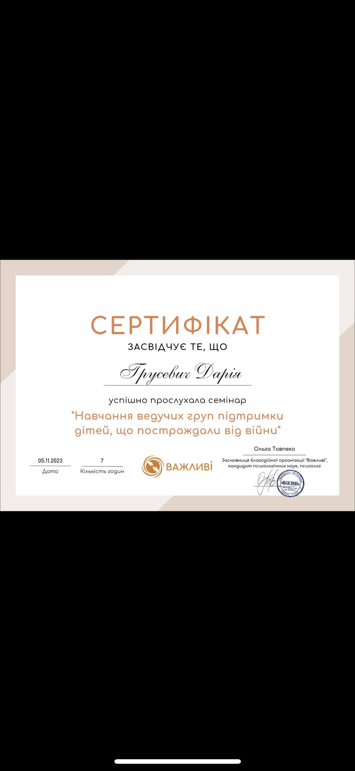 прошла курс «Профилактика эмоционального выгорания и работа со стрессом в условиях войны» (14 часов) и «Кризисная психологическая помощь» (10 часов) у военного психолога Наталии Шейко.