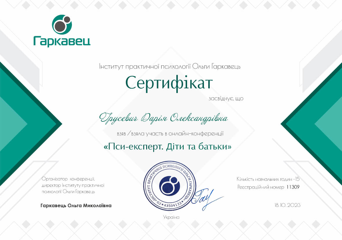 Прошла авторский курс "ДНК психотравмы" (20 часов) от международной академии практической психологии.