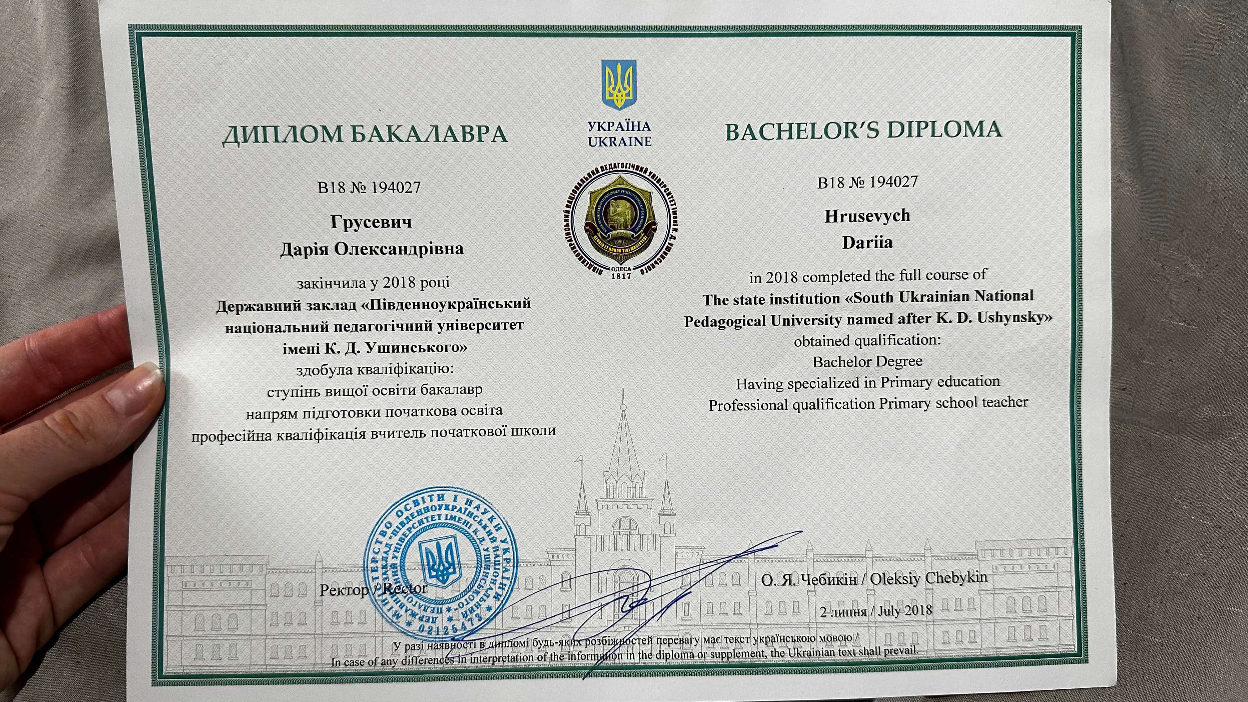 Окончила ЮНПУ им. Ушинский по специальности Учитель начальных классов.