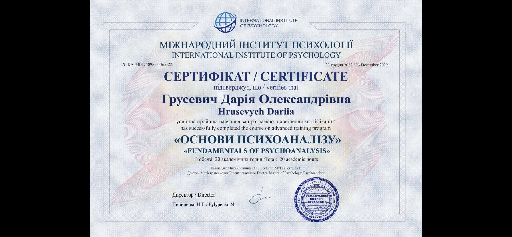 Прошла практико-ориентировочный курс "консультирование и психотерапия травмы войны" (72 часа) и "основы психологического консультирования" (32 часа), а также принимала участие в таких конференциях как "война в работе психолога", "помощь в военное время", " арт-терапия. Базовые направления и техники в работе с клиентами», «усталость и апатия», «дети и родители», «антистресс», «спасение в эмиграции» «СДВГ как особенность работы мозга» в институте практической психологии А. Гаркавец.
