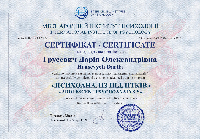 Прошла курсы "Основы современной психосоматики" (16 часов), "психоанализ подростков" (16 часов), "основы квантовой психологии" (16 часов), "основы психоанализа" (16 часов) в международном институте психологии.