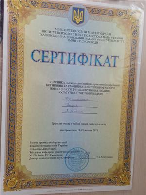 Харьковский национальный педагогический университет им. Г.С. Сковороды - психолог, Московский институт Гештальта и Психодрамы - сертифицированный терапевт. Тренерская специализация. Различные курсы АРТ терапии, песочной терапии, работа с МАК, телефон доверия и т.д.