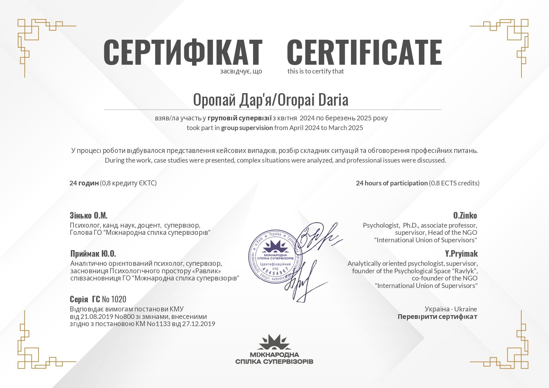 ● Сертификат участия в годовом групповом супервидении с апреля 2024 по март 2025, Международный союз супервизоров