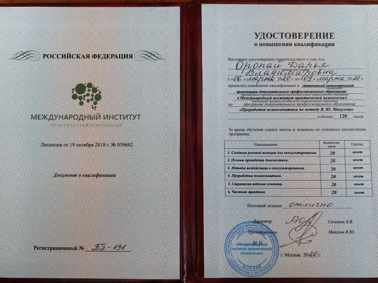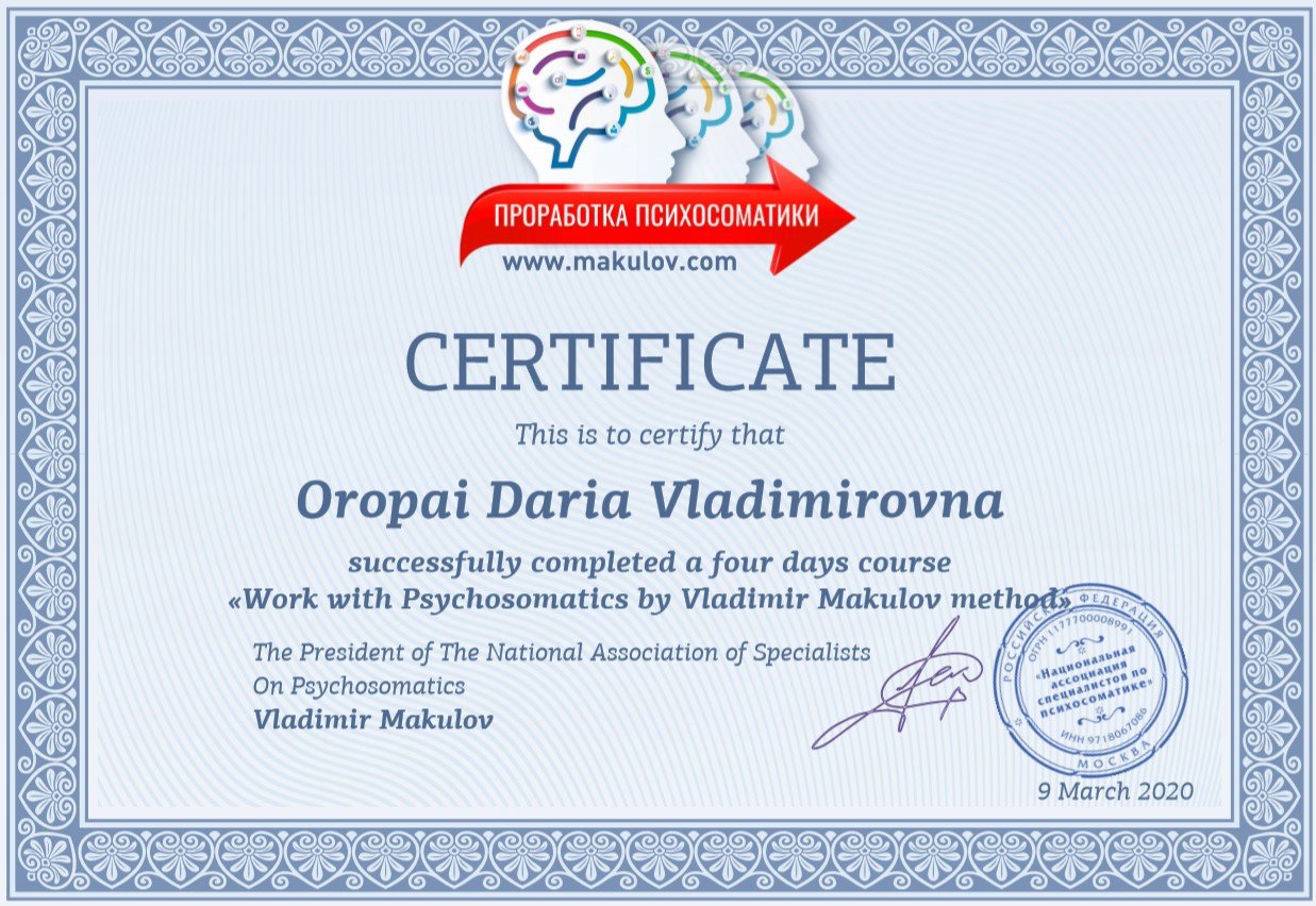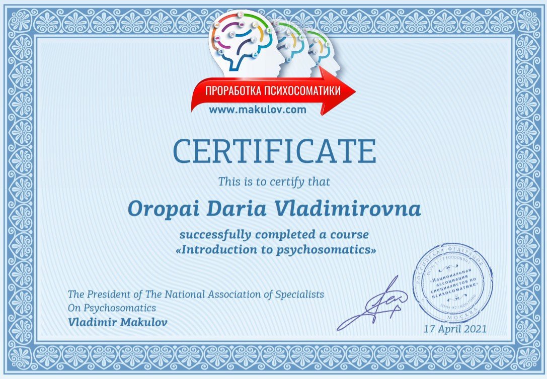 ● Психосоматика: этиология, диагностика, терапия, 21.02.2021, №1454, ЦППП "Инсайт".