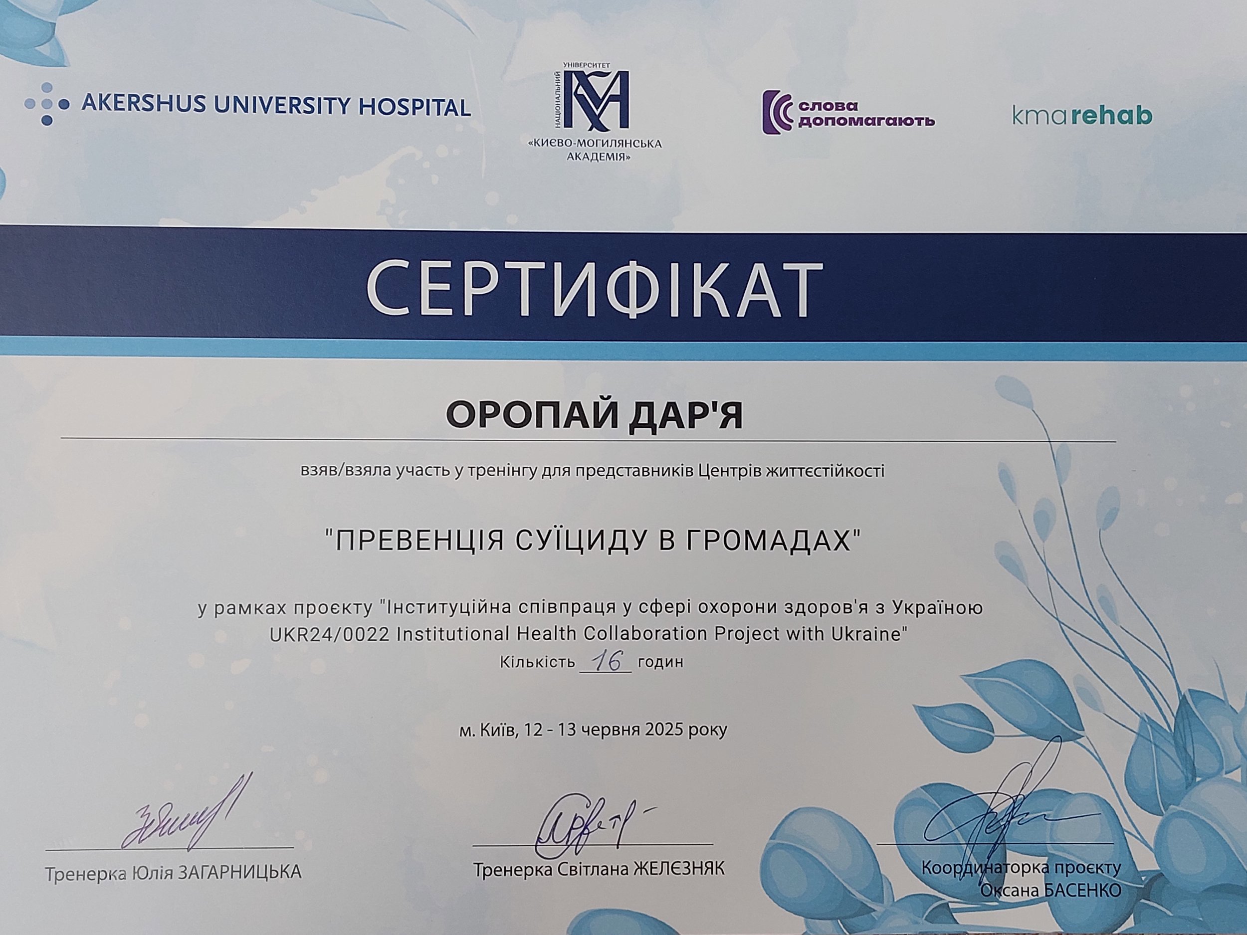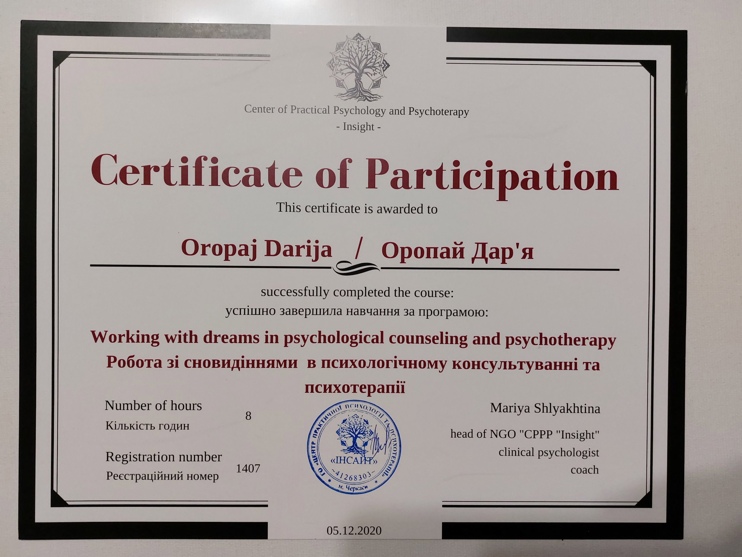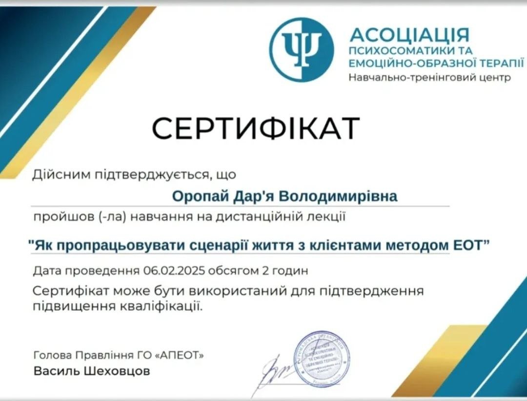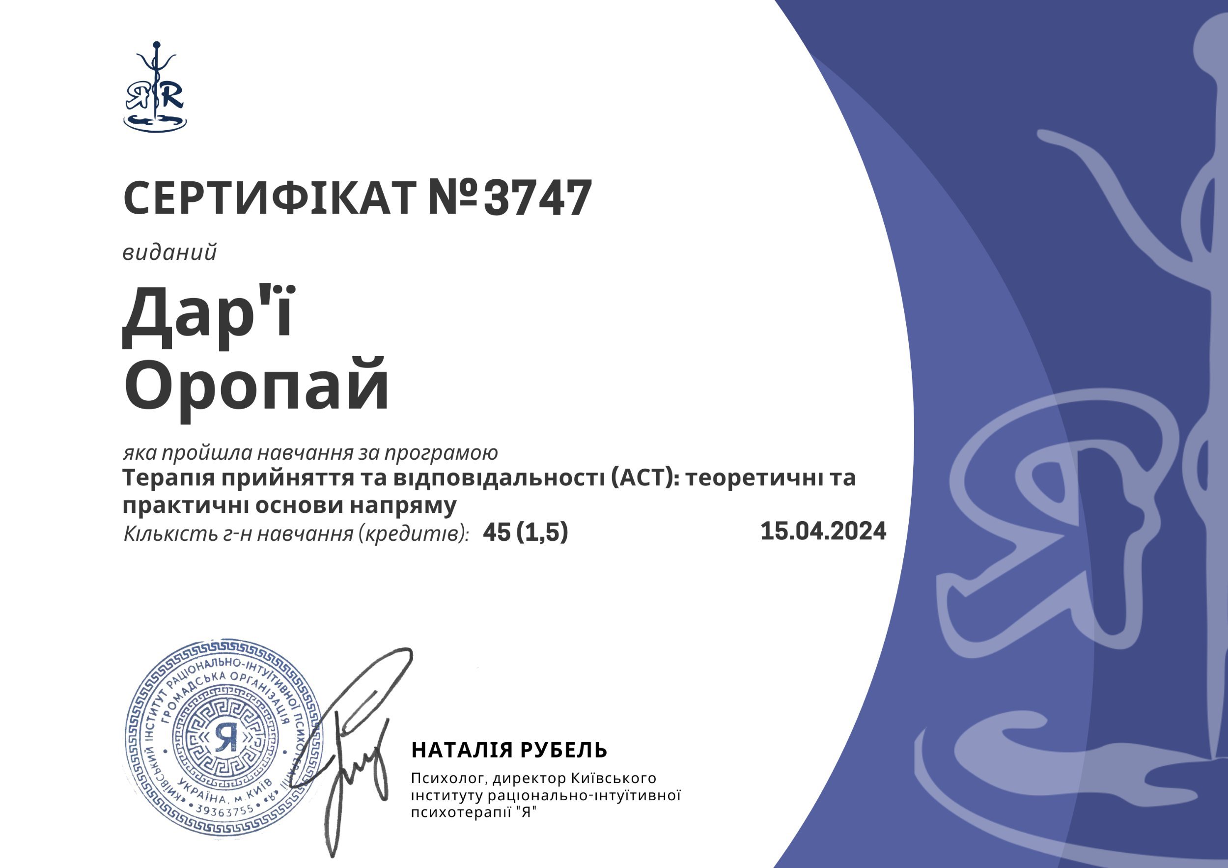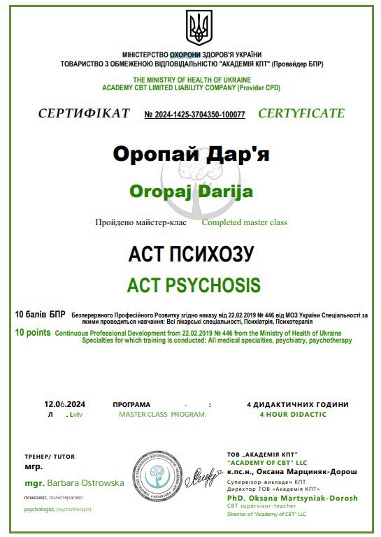 ● "Терапия принятия и ответственности (АСТ): теоретические и практические основы направления", №3747, 15.04.2024, Киевский институт рационально-интуитивной психотерапии "Я".