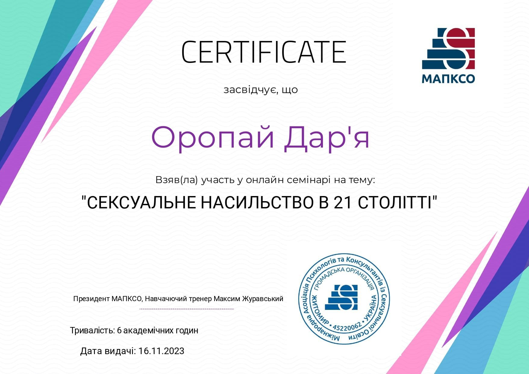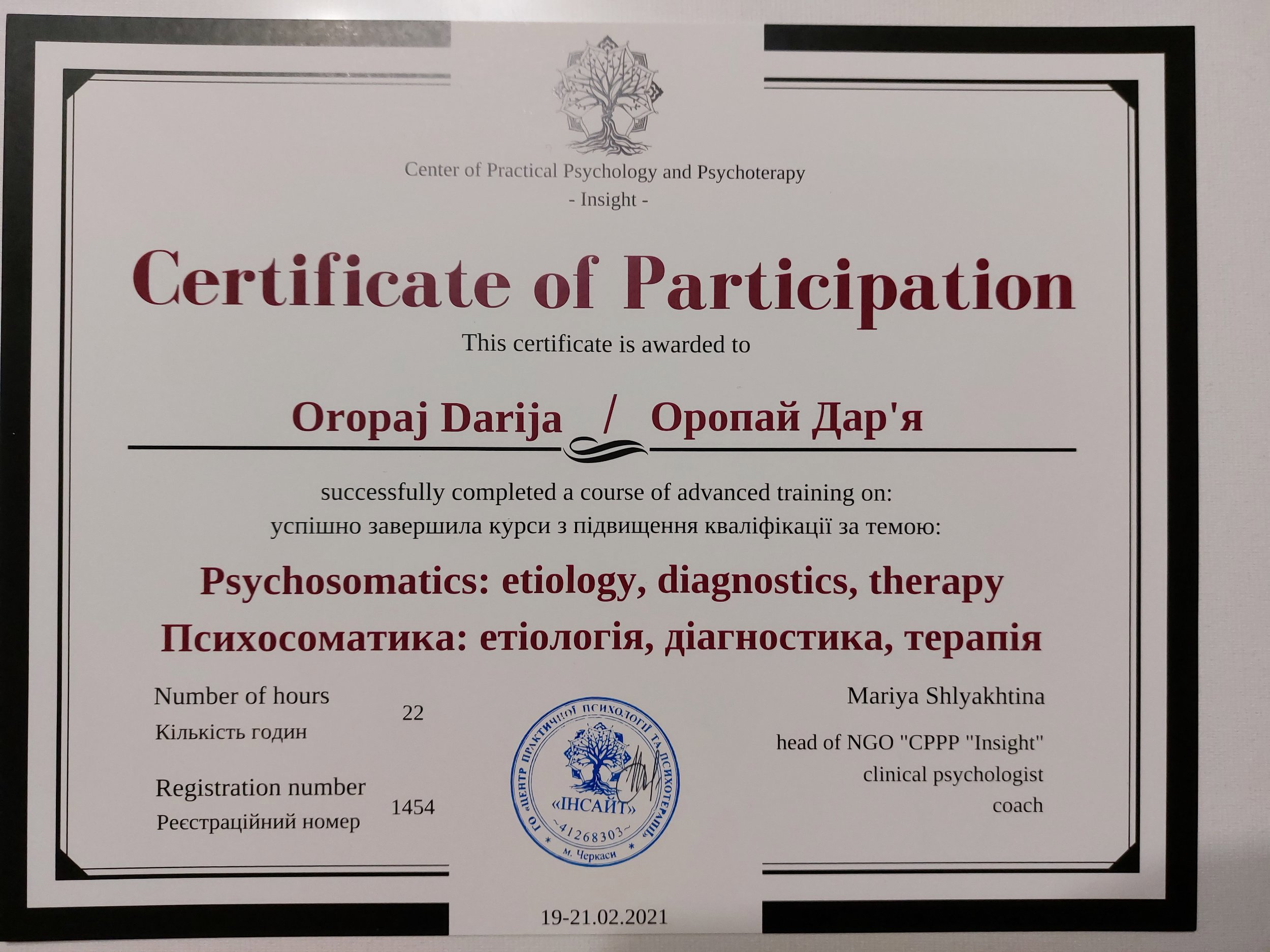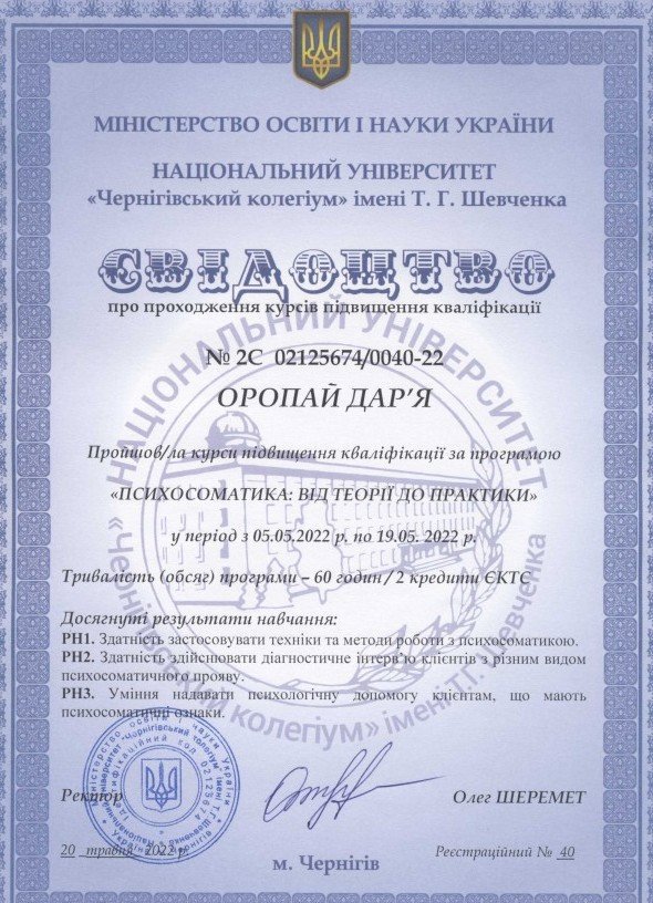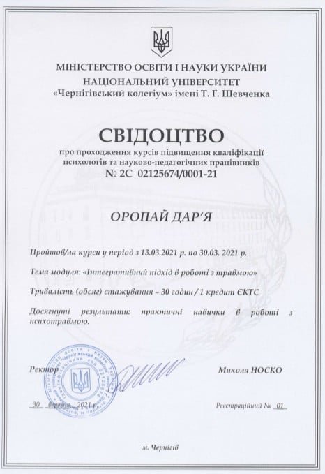 ● "Интегративный подход в работе с психотравмой", №2С 02125674/0001-21, №01, 30.03.2021, НУ "Черниговский коллегиум" имени Т.Г. Шевченко.
