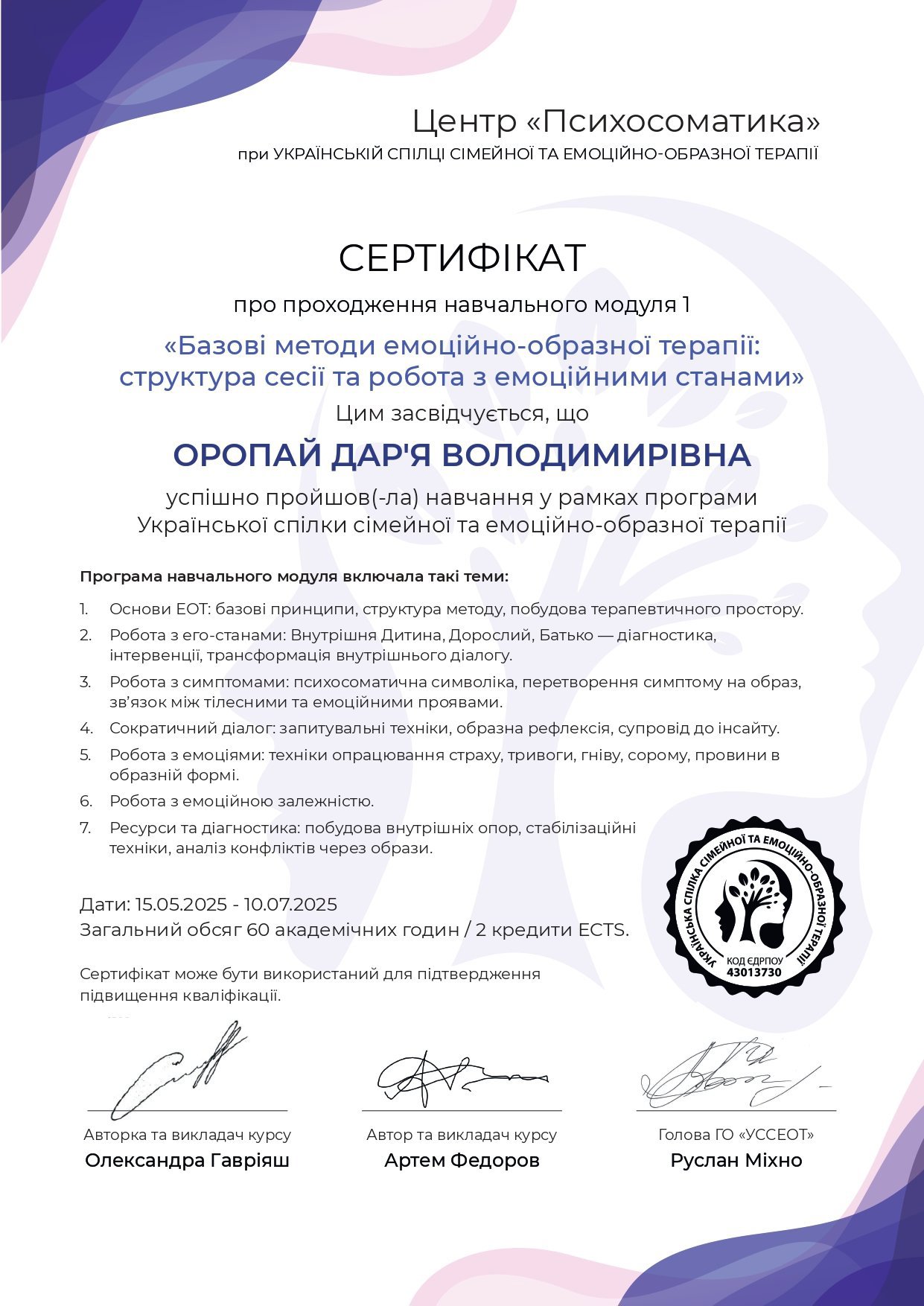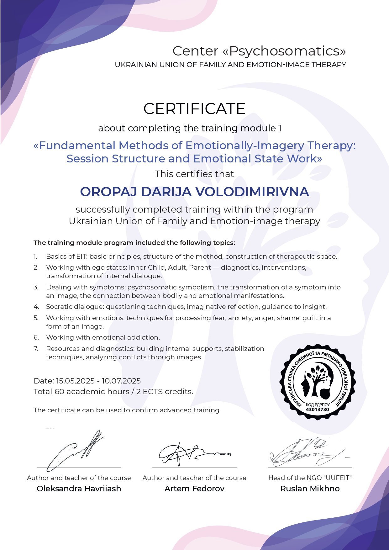 ● Образная диагностика и терапия внутренних структур клиента, Центр «Психосоматика» при украинском союзе семейной и эмоционально-образной терапии, 07.08.2025 - 25.09.2025, 60 часов