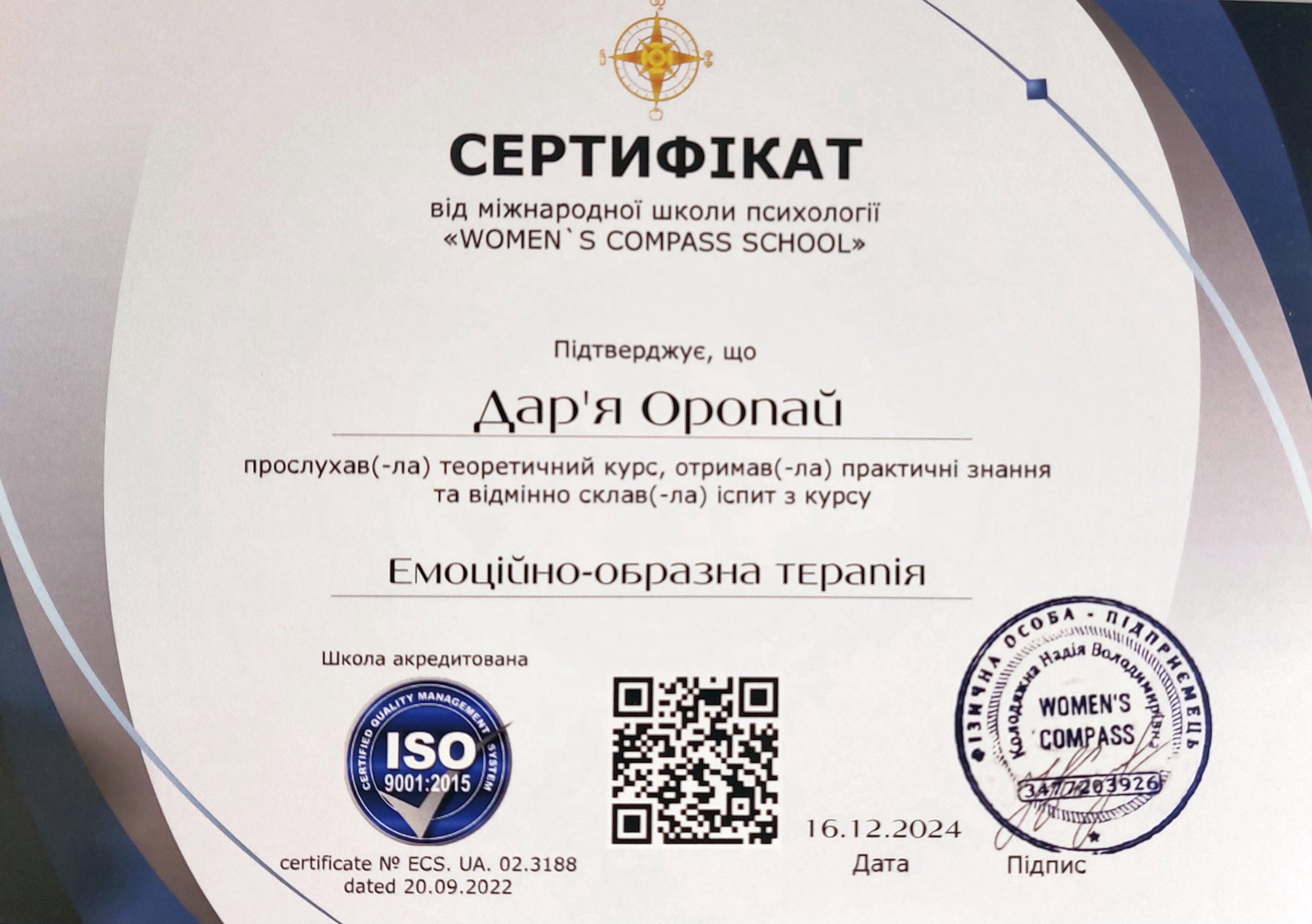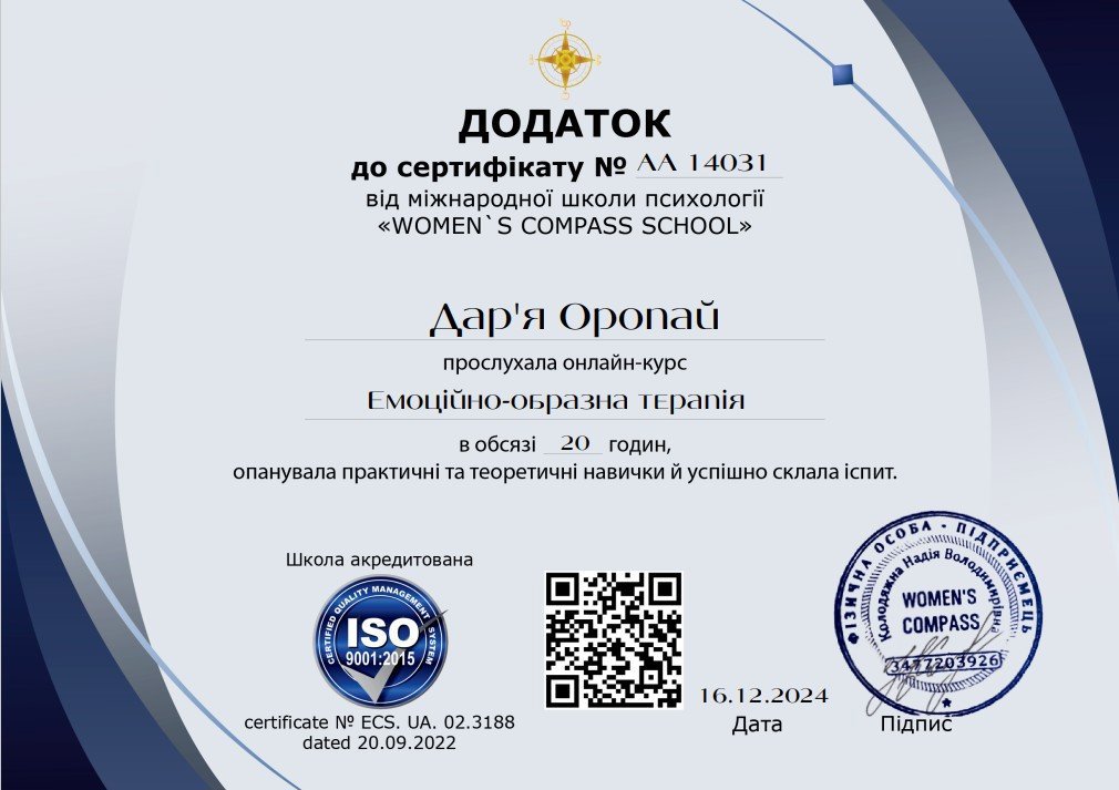 ● Эмоционально-образная терапия, №ECS. UA. 02.3188, 20 часов, 16.12.2024, Women's Compass School.