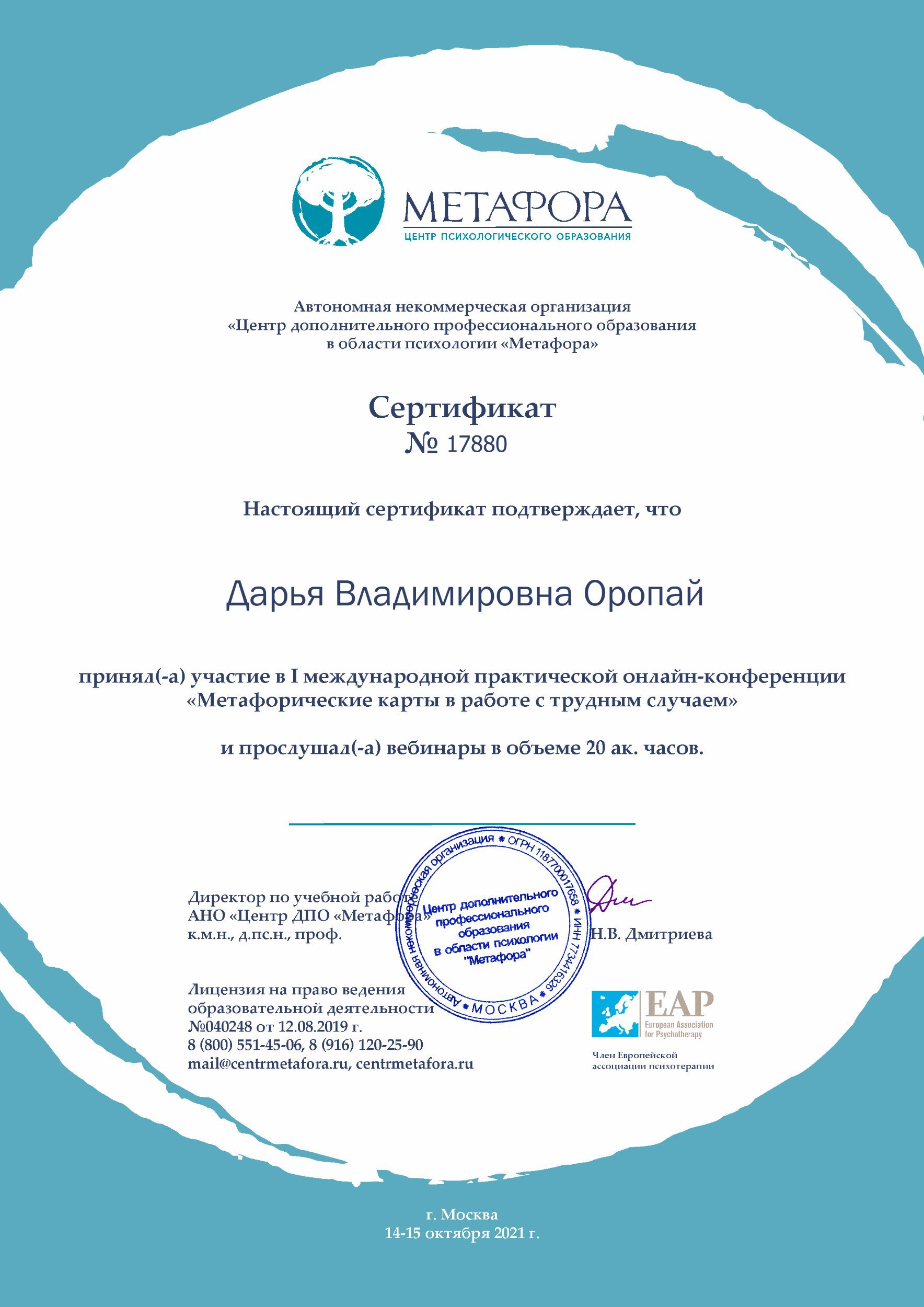● "Метафорические карты в работе со сложным случаем", №17880, 15.10.2021, ЦПО Метафора.