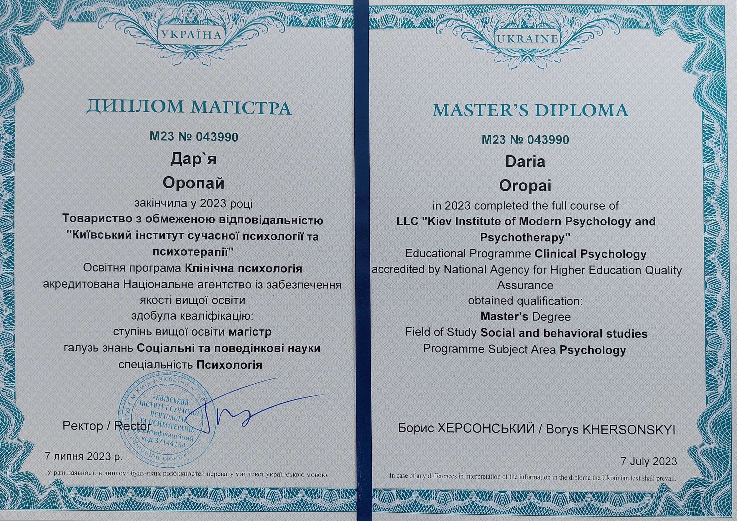 Базовое образование: диплом магистра от 07.07.2023 г. М23 №043990 ООО «Киевский институт современной психологии и психотерапии» образовательная программа Клиническая психология.