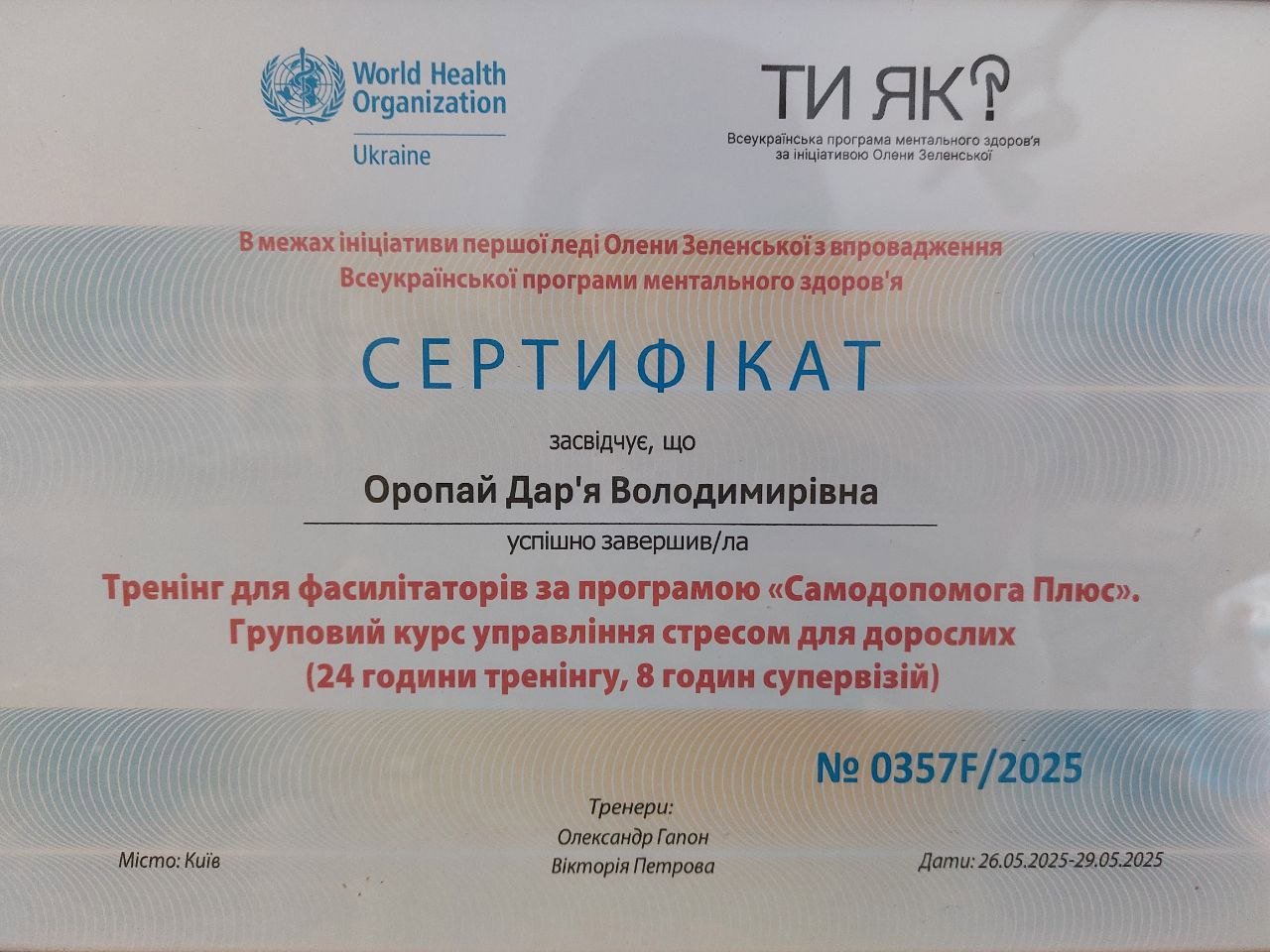 ● Сейчас учусь на сертификационном курсе от ВОЗ «Управление проблемами +» и посещаю годовую супервизионную группу Юлии Приймак по психологическому консультированию, и годовую группу по превенции суицида в общине Светланы Зализняк