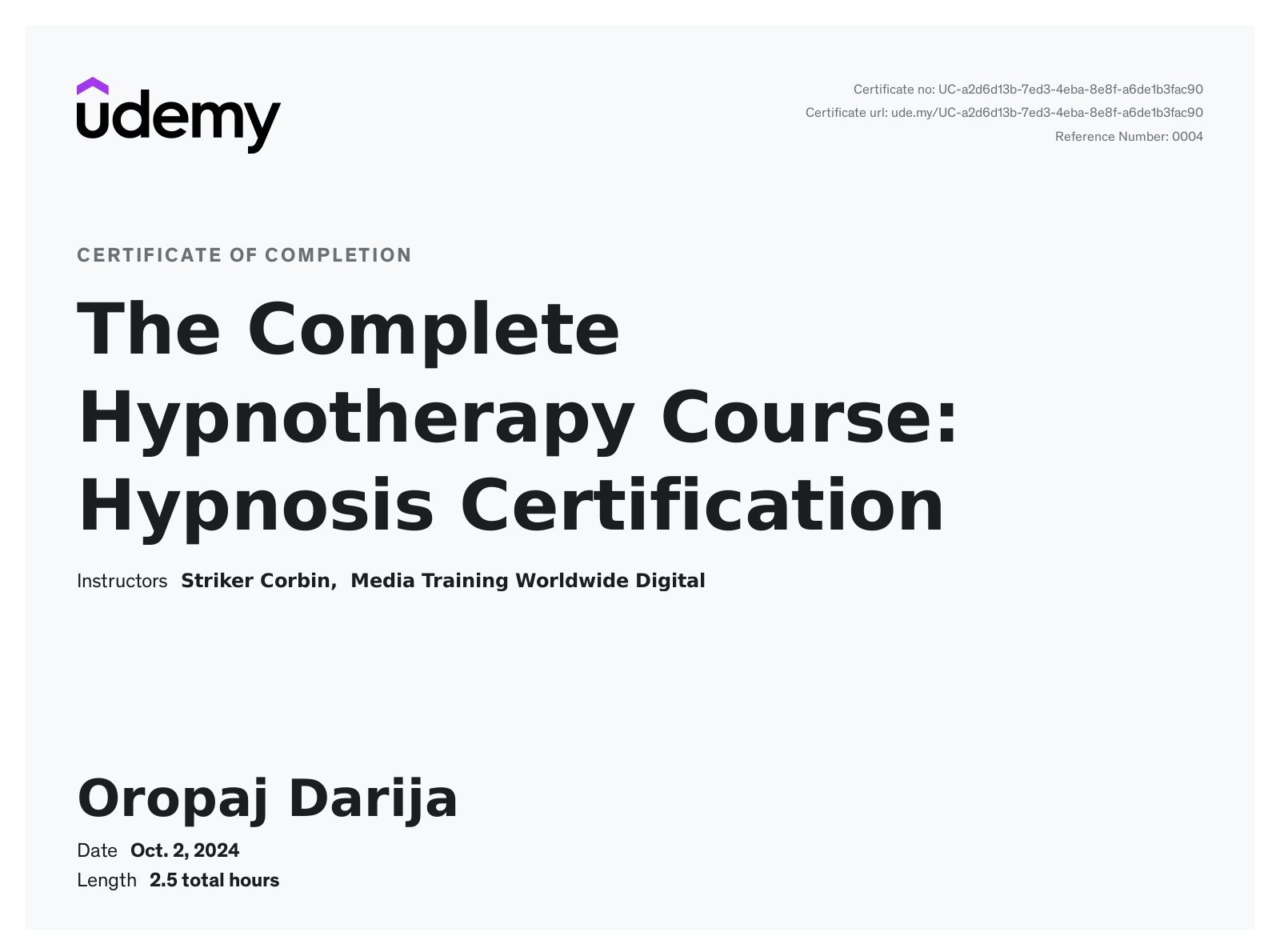 ● "The Complete Hypnotherapy Course", Udemy, Striker Corbin, 2024.