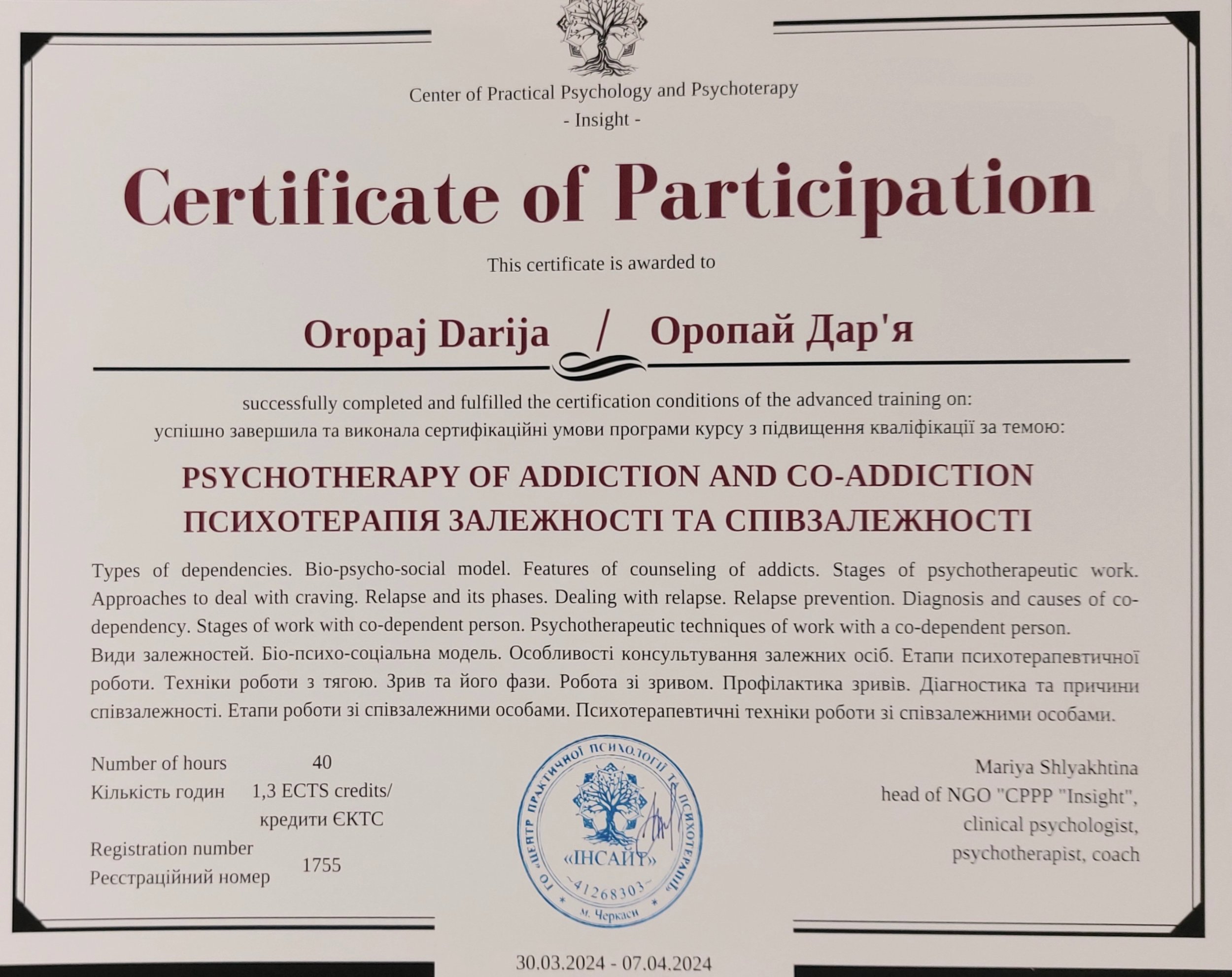 ● "Психотерапия зависимости и созависимости", №1755, 07.04.2023, ЦППП "Инсайт".