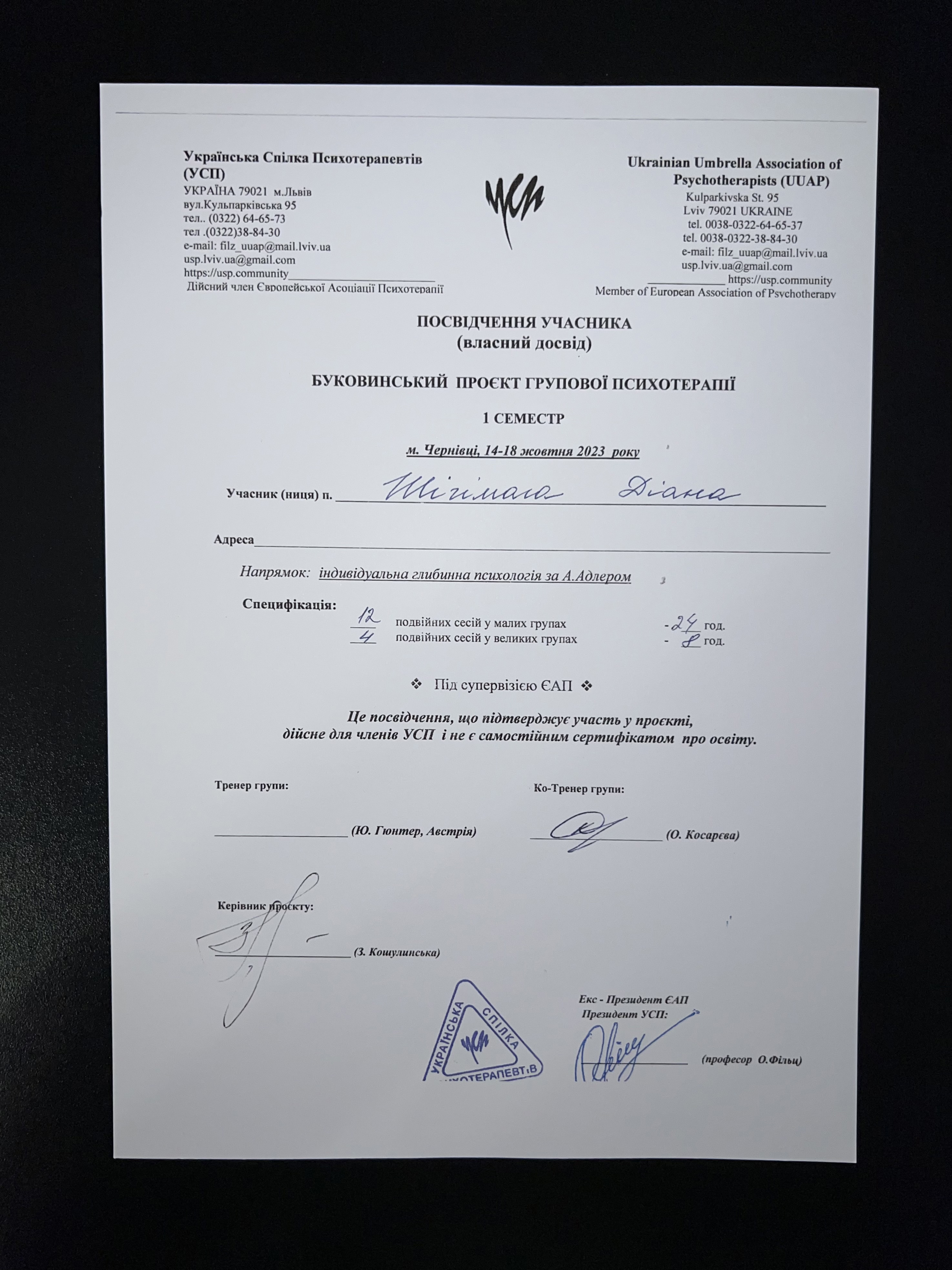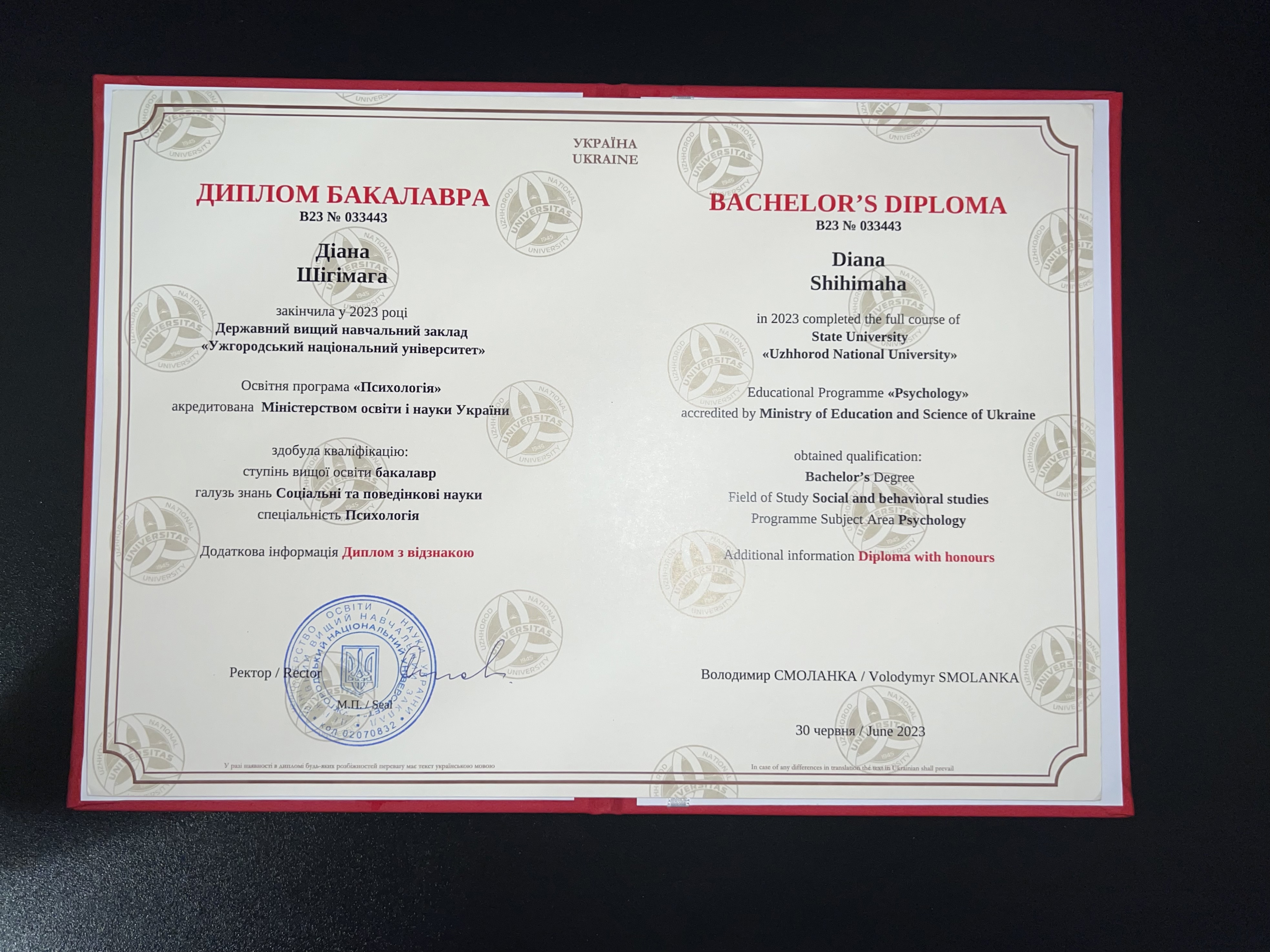 Окончила обучение по образовательной степени бакалавр с отличием. Специальность – «Психология». В настоящее время заканчиваю обучение на магистратуре по этой же специальности. Параллельно прохожу 5-ти летнюю учебу на психотерапевте по направлению Индивидуальная психология Альфреда Адлера. Кроме того, постоянно обучаюсь на курсах повышения квалификации, также занимаюсь написанием научных работ по психологии и постоянно пополняю багаж своих знаний путем самостоятельного изучения литературы.