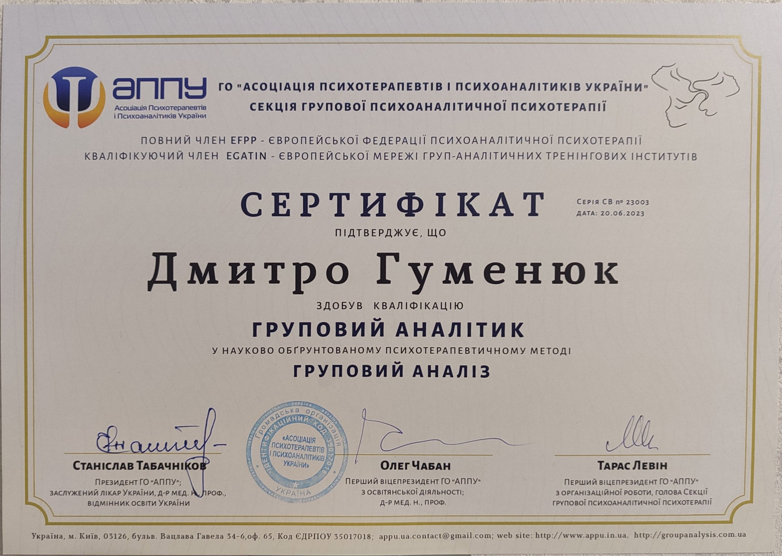 2015 – 2023 – прошел обучение в проекте АППУ-EGATIN (ассоциация психотерапевтов и психоаналитиков Украины) секции "групповой анализ".
