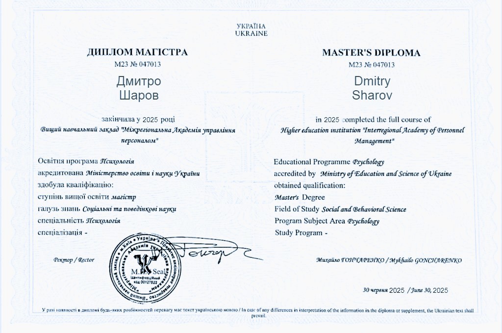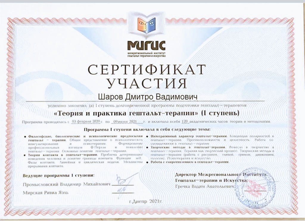 Также сертификат Международного института Гештальт-терапии и искусства